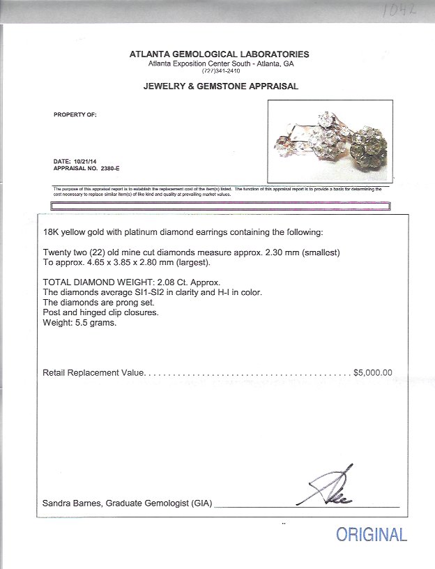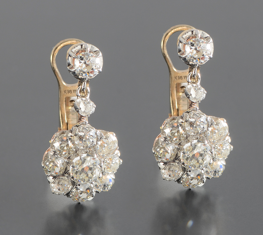 18K WITH PLATINUM EDWARDIAN DIAMOND EARRINGS: Cluster of 22 old mine cut diamonds totaling approx. 2.08 Ct., SI1 clarity and H-I color. Drop measures 7/8''. Adapted with Omega post and hinged clip closure. Weight 5.5 grams. Sold with current Atlanta Gemological GIA graduate's appraisal for $5000.