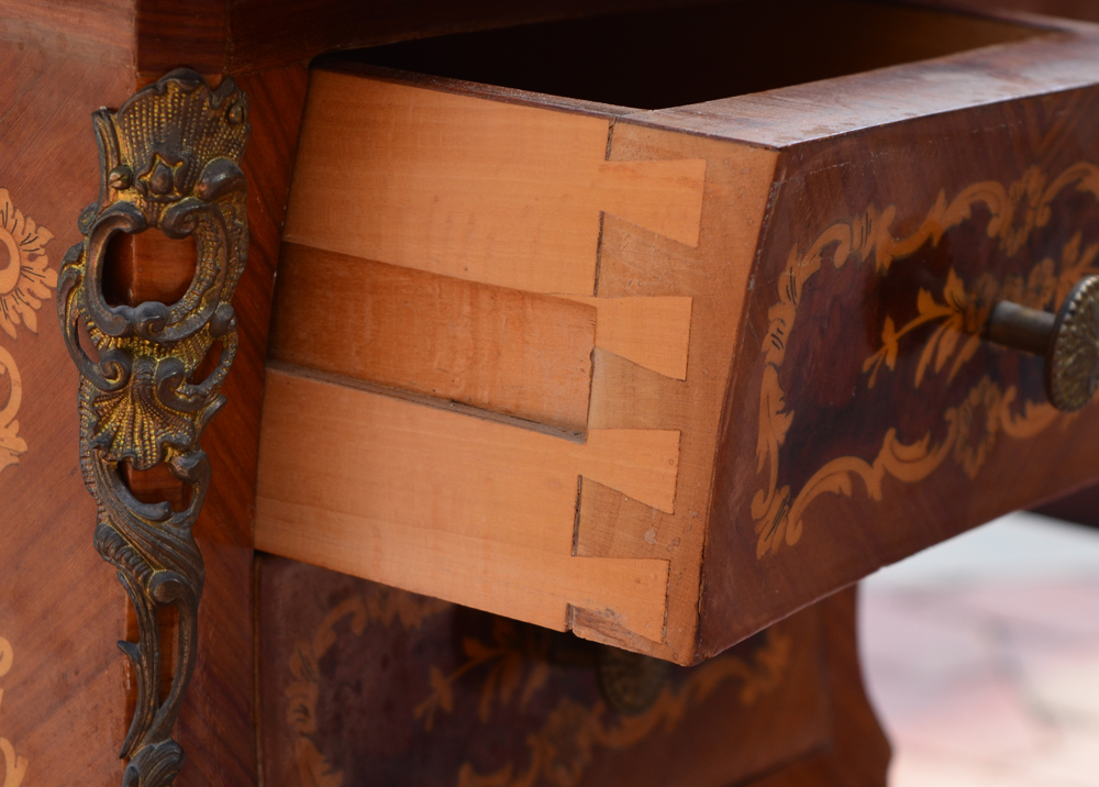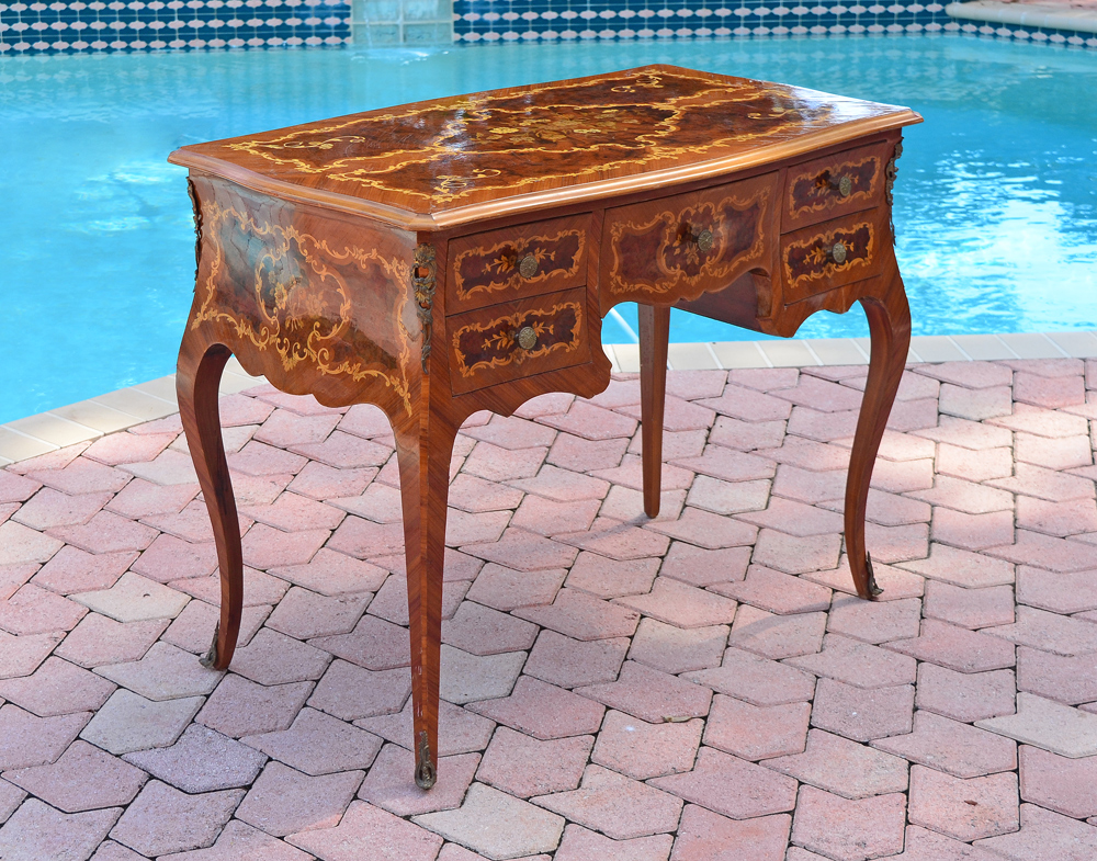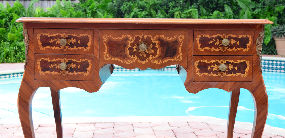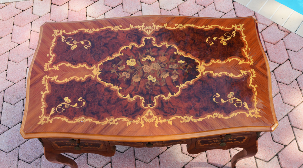 FRENCH FLORAL MARQUETRY INLAID DESK: Burl and floral inlay all over, shaped top over 5 drawers, ormolu mounts, shaped legs.