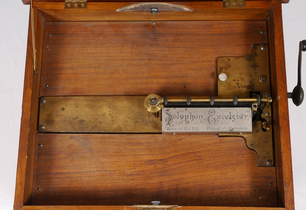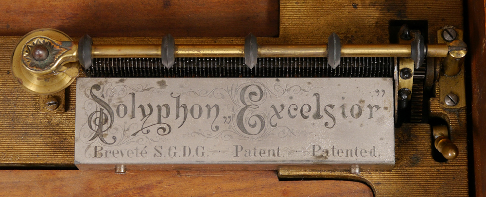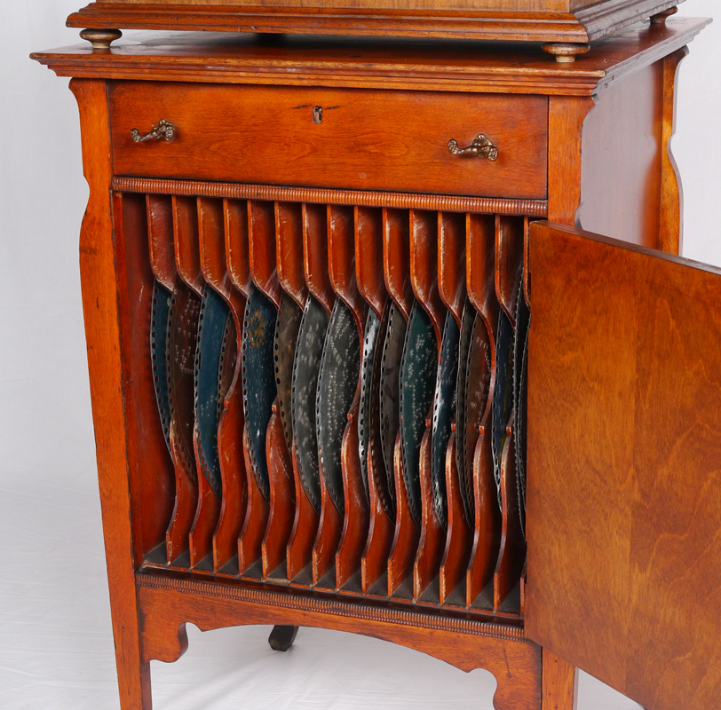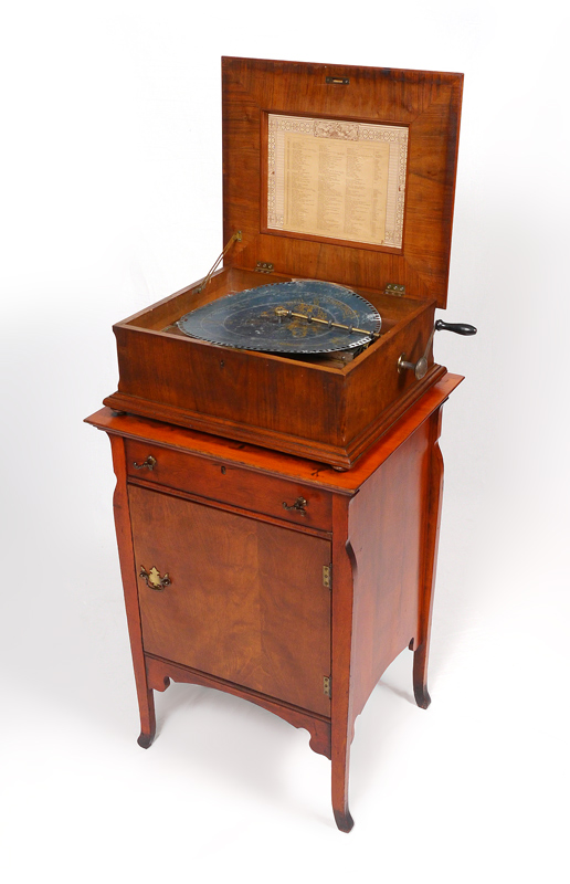 POLYPHON EXCELSIOR DISC PLAYER AND MUSIC CABINET: 15.5'' disc player, walnut case with engraved decoration in top panel. Single comb marked ''Polyphon Excelsior, Brevete SGDG, Patent Pending''. Interior label with list of records available. Overall 8 1/2'' h. x 21'' x 18''. Sold with a single drawer over single door music cabinet and 18 discs. Cabinet measures 34 1/4'' h. x 23 1/4'' x 21 1/4''.