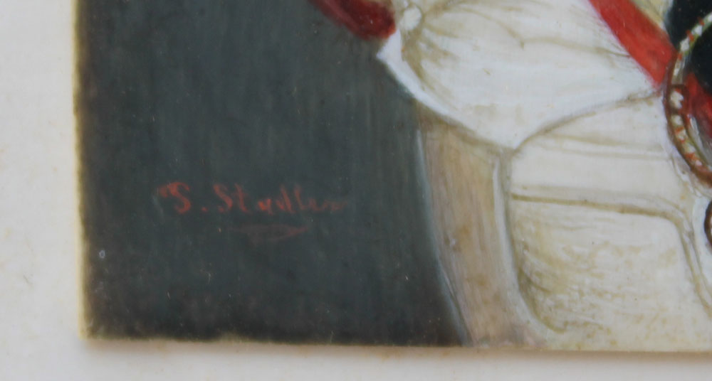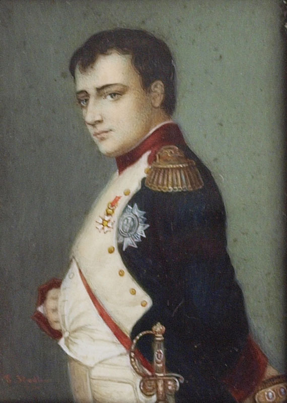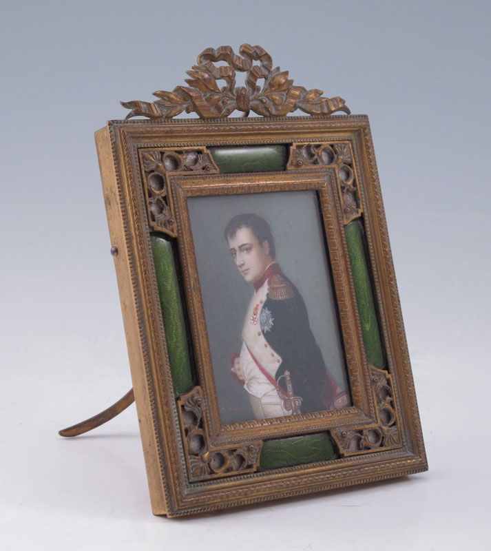 19TH C. MINIATURE OF NAPOLEON BONAPARTE: Signed P. STADLER, sight size 2 1/2'' x 2'', encased in period bronze and guilloche frame with scrolling foliate motif and bow cartouche at the top, 5'' x 3 1/2''.