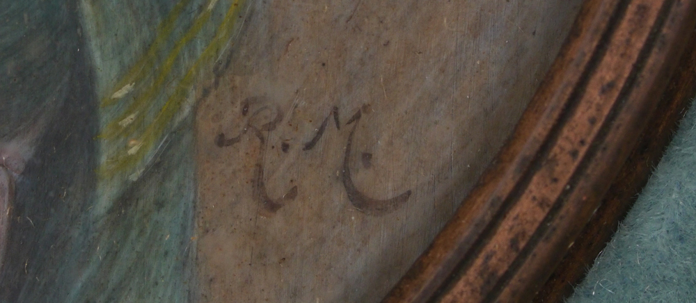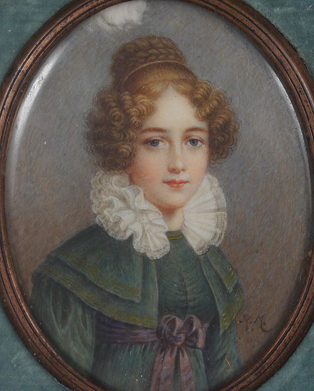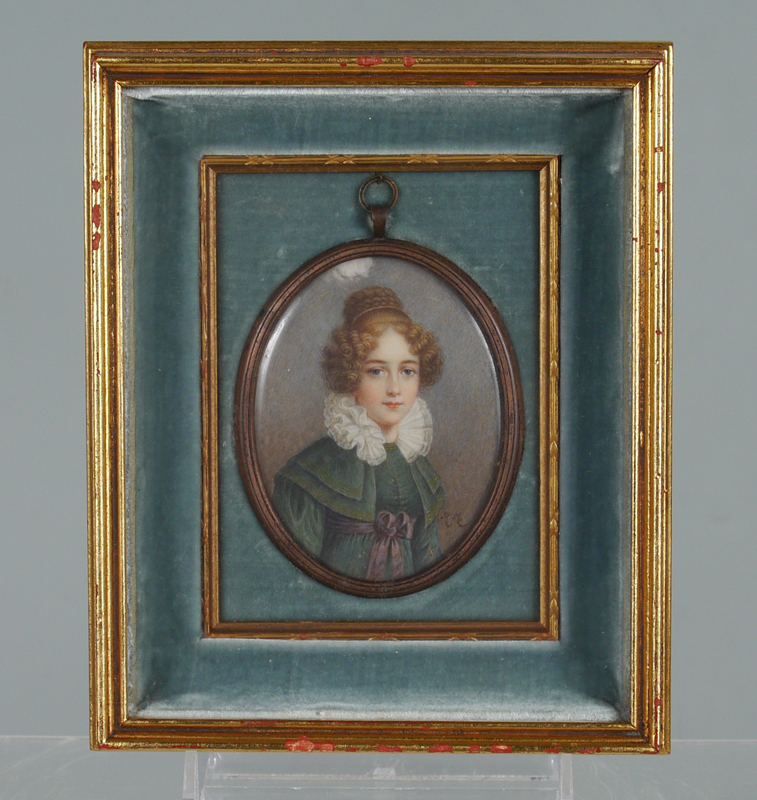 EXCELLENT MINIATURE PAINTING OF PAULINE BONAPARTE?: Oval Sight size 3'' x 2 1/2'', monogrammed lower right ''RM'', shadowbox style framing 6 3/4'' x 5 1/2'' x 1 1/2''.
