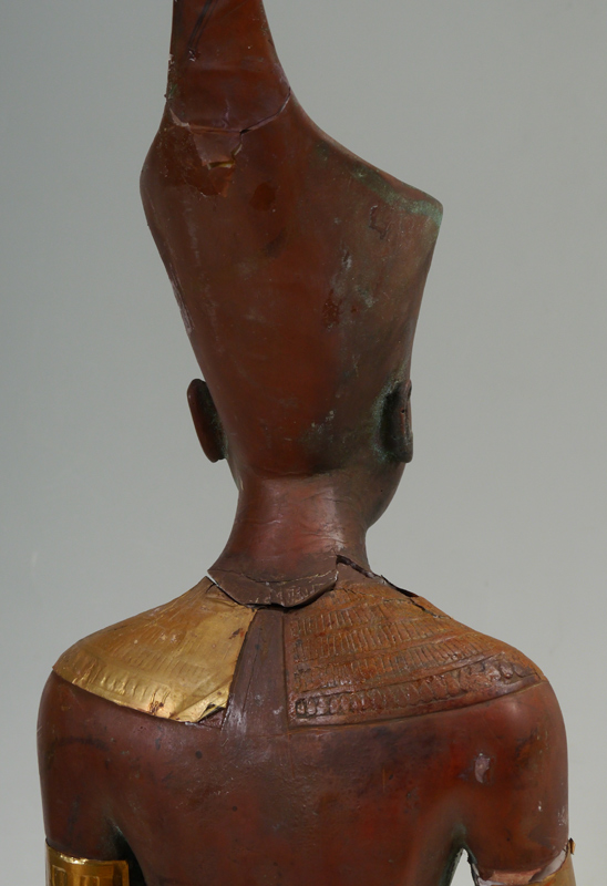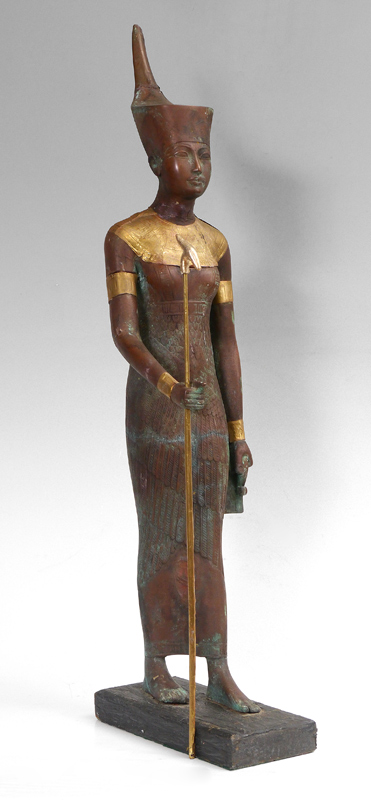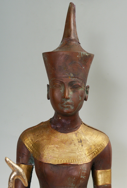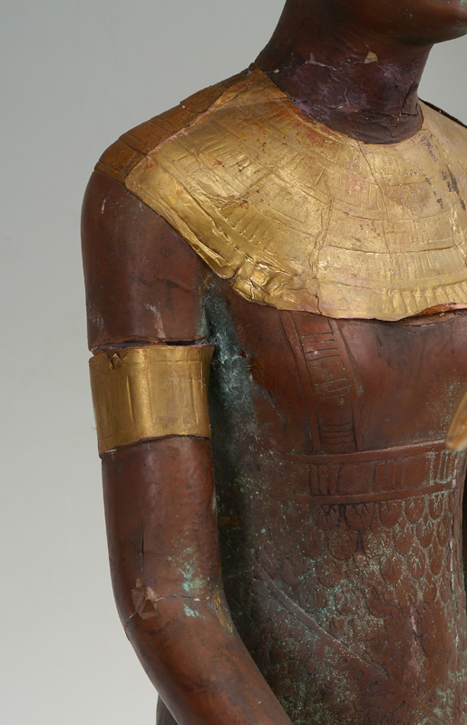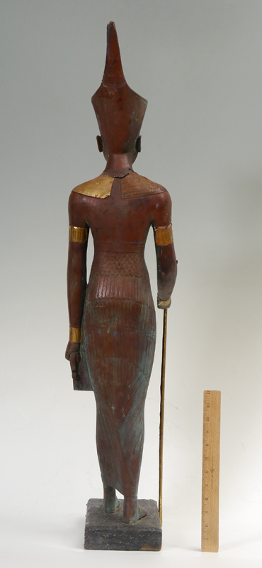 MIXED METAL AND WOOD COPPER CLAD MARBLE EGYPTIAN FIGURE: Clad in copper and brass, 38 1/2''h. x 12'' x 8 1/4'' with wooden base.