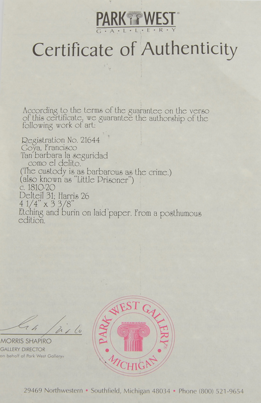 DE GOYA Y LUCIENTES, Francisco Jose, (Spanish, 1746-1828): ''Little Prisoner'', Etching, Sight size 5 1/2'' x 4 1/2'', contemporary frame 19 1/2'' x 18 1/2''. From a Posthumous Edition.
