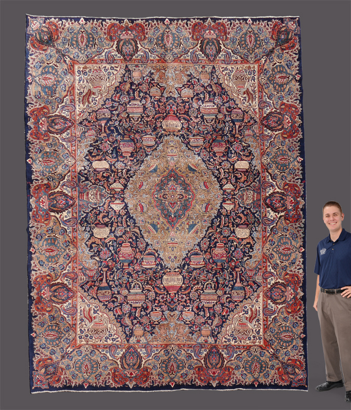 APPROX. 40-60 YR. OLD PERSIAN HAND KNOTTED WOOL RUG, 9'9'' x 13'2'': This fascinating Persian rug is literally covered with vases on the blue field and in the large ivory diamond shaped center medallion and the four ivory corners of the field. The vases are in many shapes and sizes and are in pairs that are either just opposite each other or on opposite sides of the rug. The vases have panels of varying designs with almost every one containing an inscription. A rug like this is not just a floor covering, but would be the source of conversation for years to come. Condition is good with a little bit of visible wear.