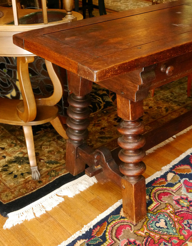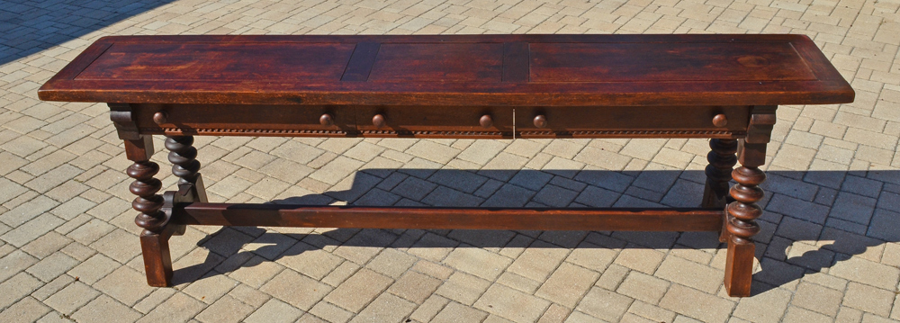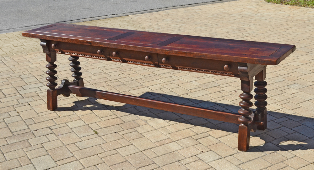 MASSIVE OAK HUNT BOARD: Paneled top over 3 drawers with turned wood handles, turned legs, through tenon stretcher. Overall 29 1/2'' h. x 97 3/4'' x 19''. Age unknown