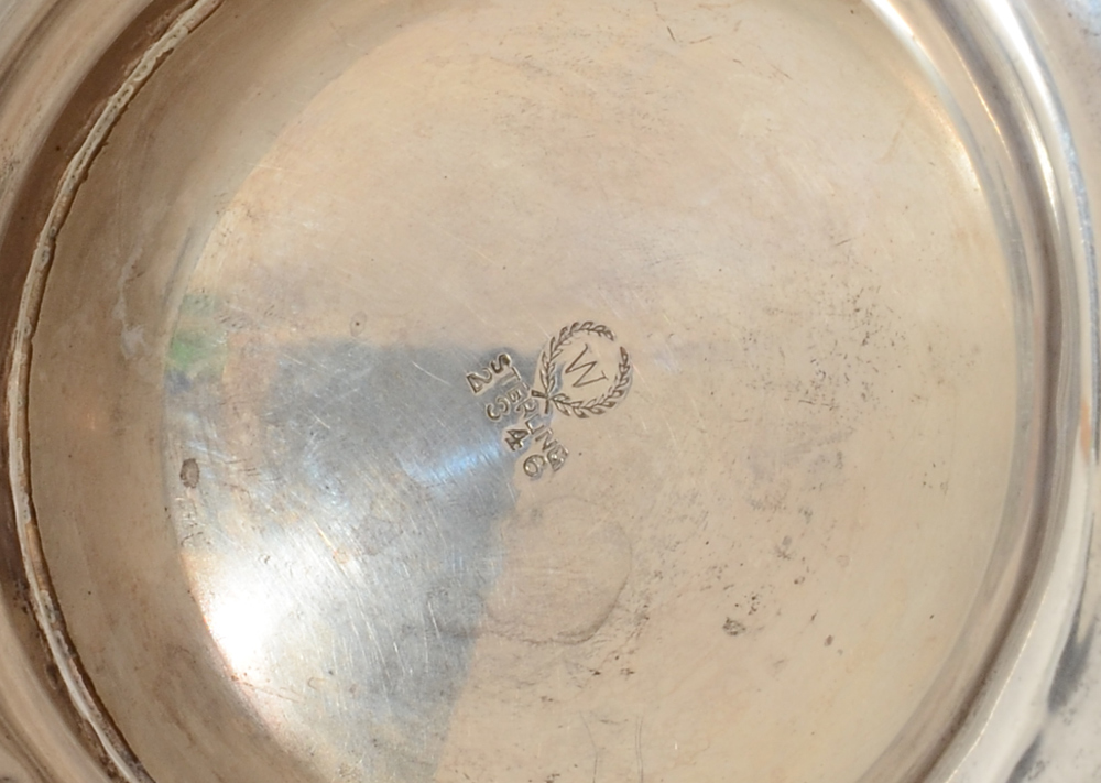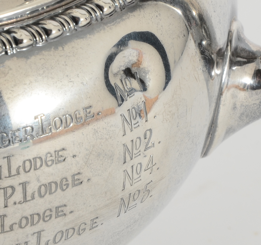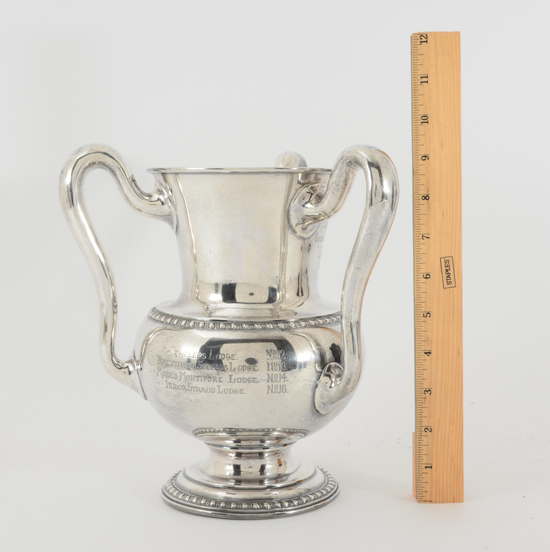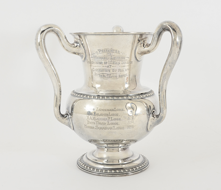 FRATERNAL STERLING PRESENTATION LOVING CUP: Triple handle loving cup by Woodside Sterling Co. with inscribed presentation ''Presented to Michael Leveen, Grand Master of I. O. King Solomon at Convention of Feb. 9th, 1913, by the Following Lodges'' then lists 9 separate lodges. Marked on base with Woodside hallmark, Sterling, 2346. Measures 9 1/2'' x 7 3/4'', approx. 25.4 troy oz.