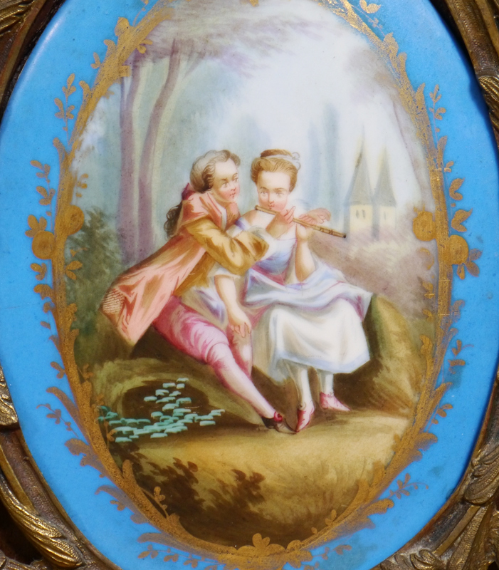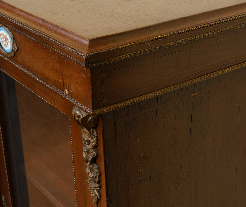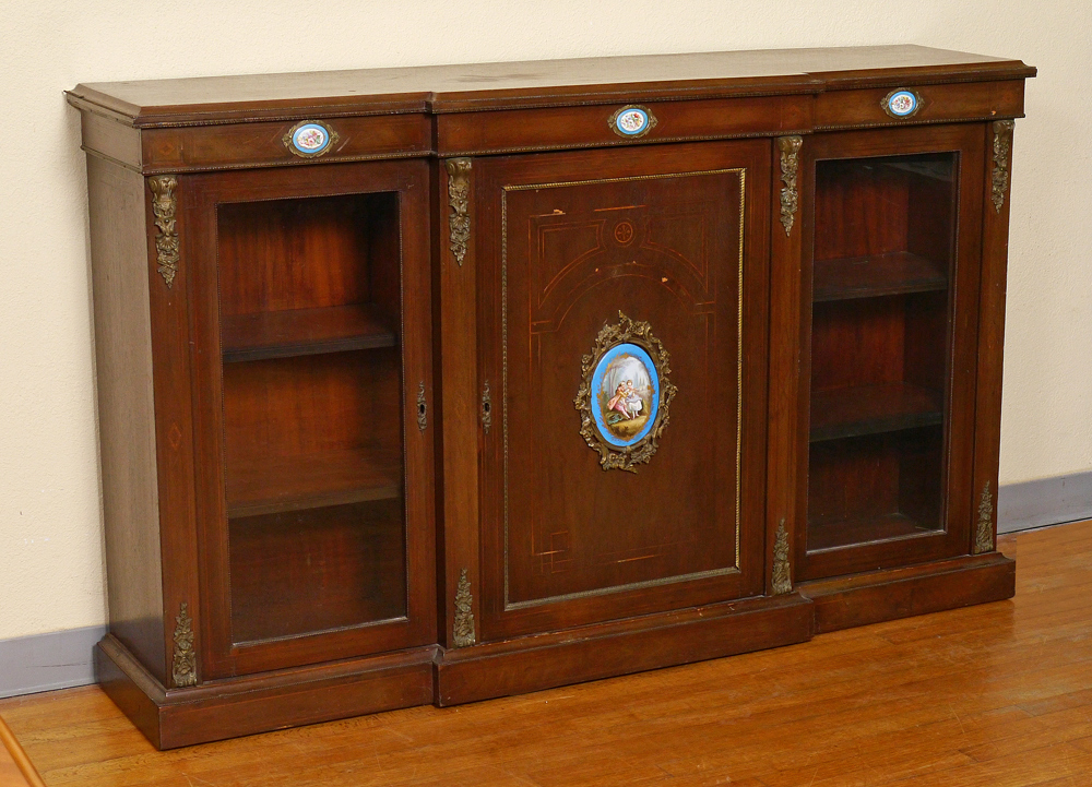 INLAID WALNUT SIDEBOARD WITH PORCELAIN PLAQUES: Shaped top and front with gadroon metal trim. Front with 3 small porcelain plaques, center door with geometric string inlay, porcelain plaque with outdoor genre scene of lovers, framed in ormolu mount. 2 glass front side doors, applied ormolu mounts. 40 1/2'' h. x 66'' x 15 1/2''.