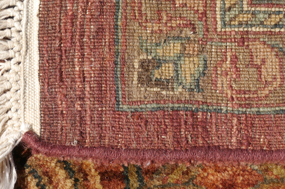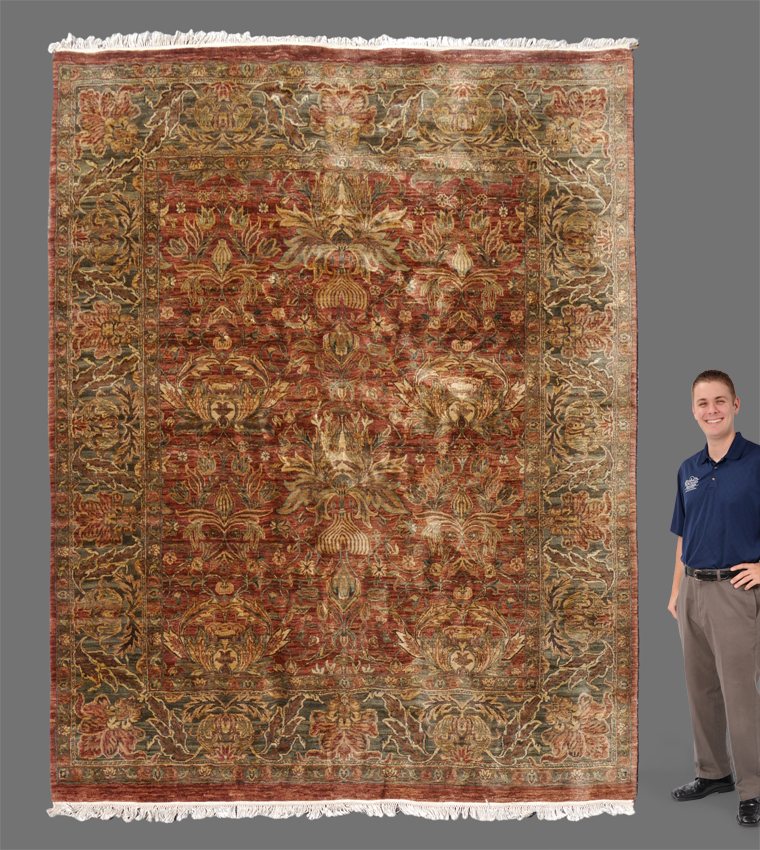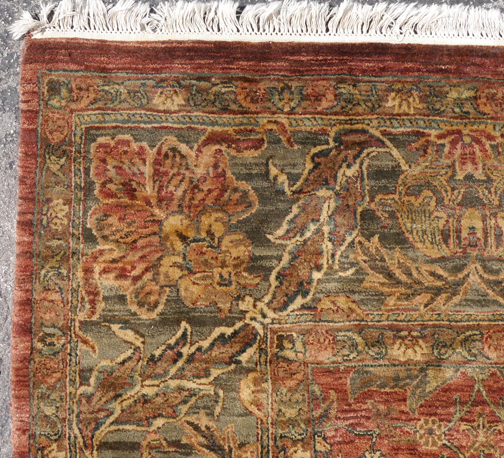 APPROX. 20-30 YR. OLD PAKISTANI-TURKISH HAND KNOTTED WOOL RUG, 8'9'' x 11'4'': This rug has extra-large motifs of open flowers, buds, and leaves going down the center of the field from top to bottom. On either side are found smaller versions of the designs. The pastel pinks, greens, yellows, ivory, and beige are all purposely variegated. The resulting effect is one of a silky sheen. The wide green border of the rug adds to the desirability of the piece since green is usually a color that is used sparingly. Condition is good.