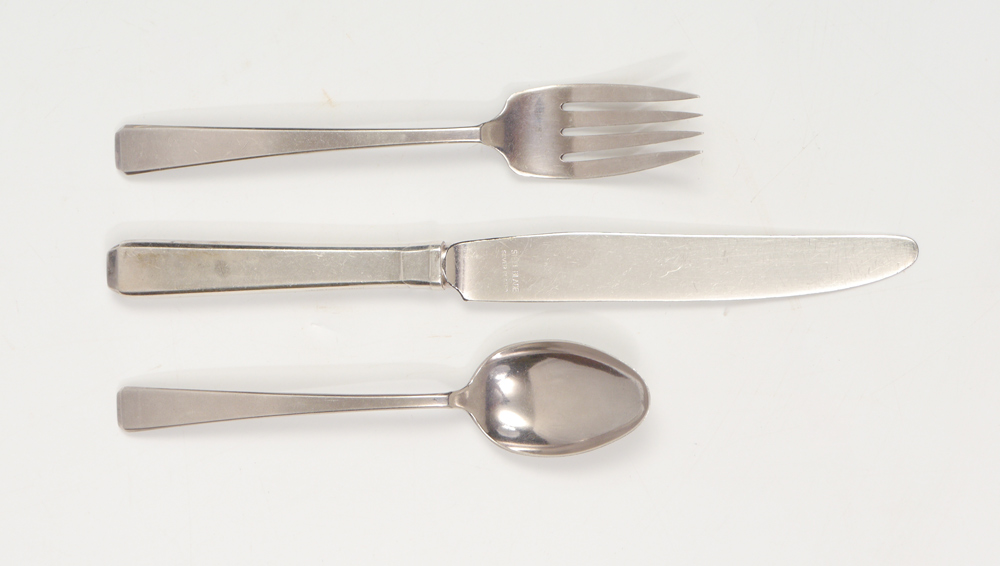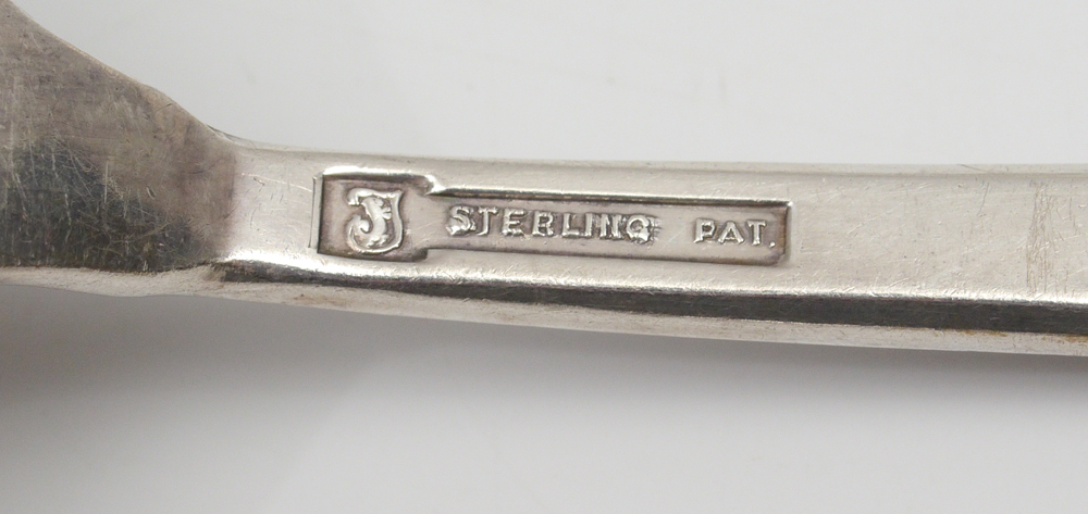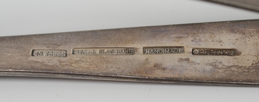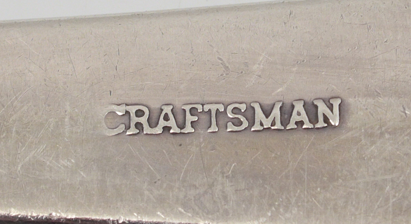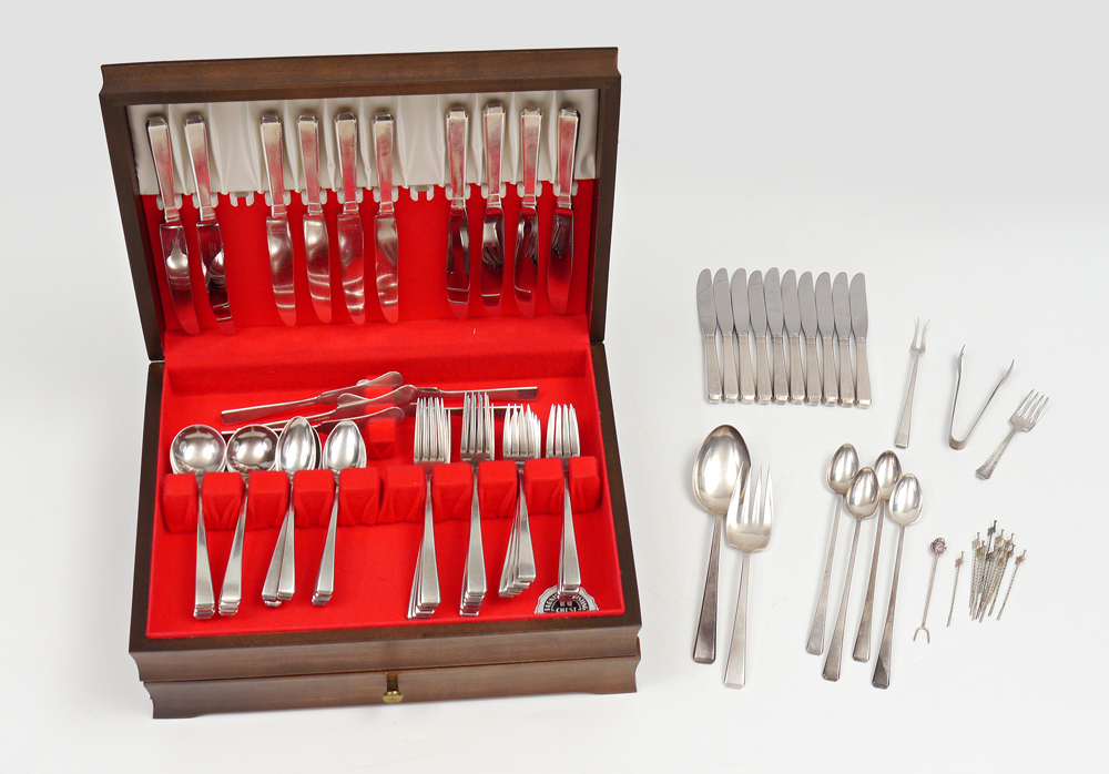 TOWLE CRAFTSMAN STERLING FLATWARE: Approx. 78 pieces in the Craftsman pattern by Towle to include 11 forks (7 1/4''), 12 salad forks (6 1/2''), 12 teaspoons (6''), 11 soup spoons (6 1/4''), 4 iced tea spoons (7 7/8''), 10 hollow knives (8 5/8''), 10 hollow butter knives (6 1/8''), 5 solid butter knives (5 7/8''), serving spoon (8 1/2''), serving fork (7 7/8''), lemon fork (6''). Sold with Porter Blanchard sterling sugar tongs (4 1/4'') and 12 assorted diminutive cocktail forks. Approx. 77.6 troy oz.