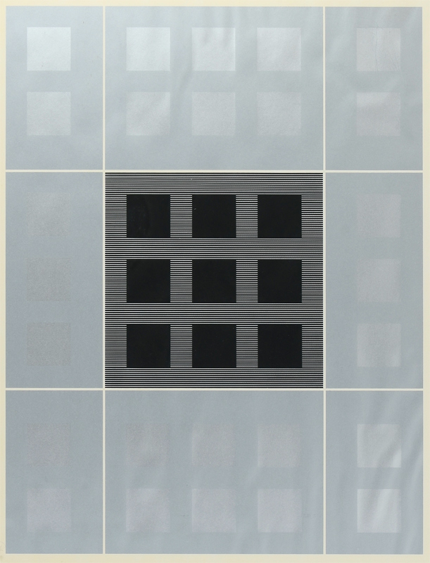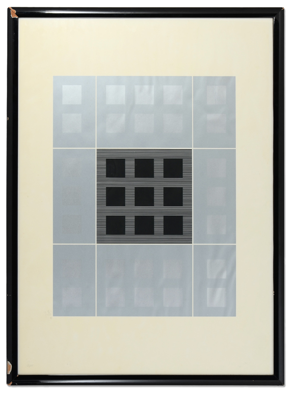 SOTO, Jesus Rafael, (Venezuela, 1923-2005): Geometric Composition with Black, Grey and Silver Squares, Silkscreen, sight size 32 1/2'' x 23'', signed lower left, numbered 69/175, blind stamp Edition Denise Rene Hans Mayer, encased in black lacquer frame, 34 1/2'' x 25''.