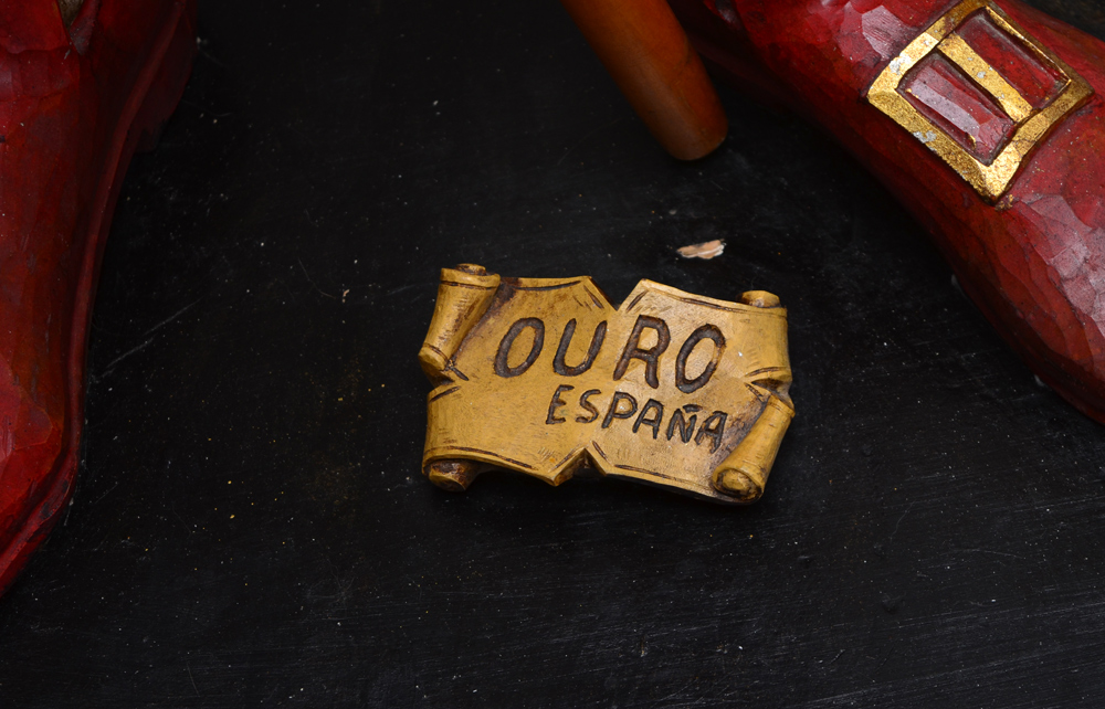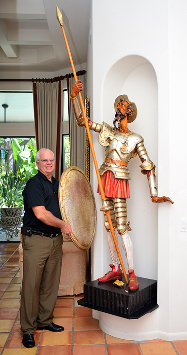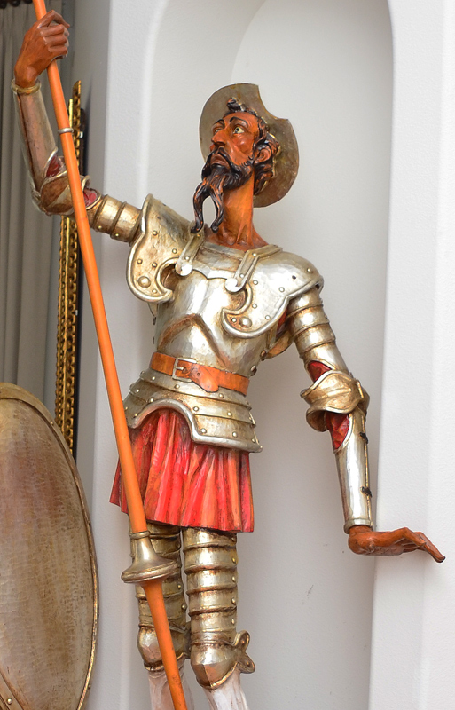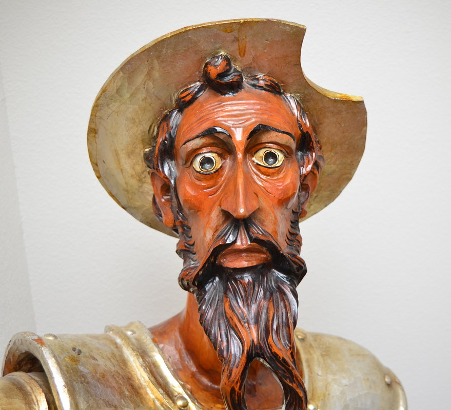 LIFE SIZE SPANISH OURO DON QUIXOTE SCULPTURE: Polychrome carved wood life size sculpture of Don Quixote holding a spear, with a shield. Marked on base Ouro Espana on a scroll, statue overall measures 82 1/2''h. x 41'' x 24'', spear 108'' long, shield 33 1/2'' x 20'' x 5''.