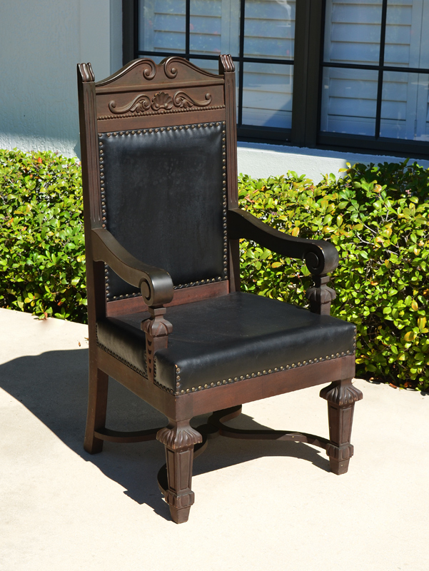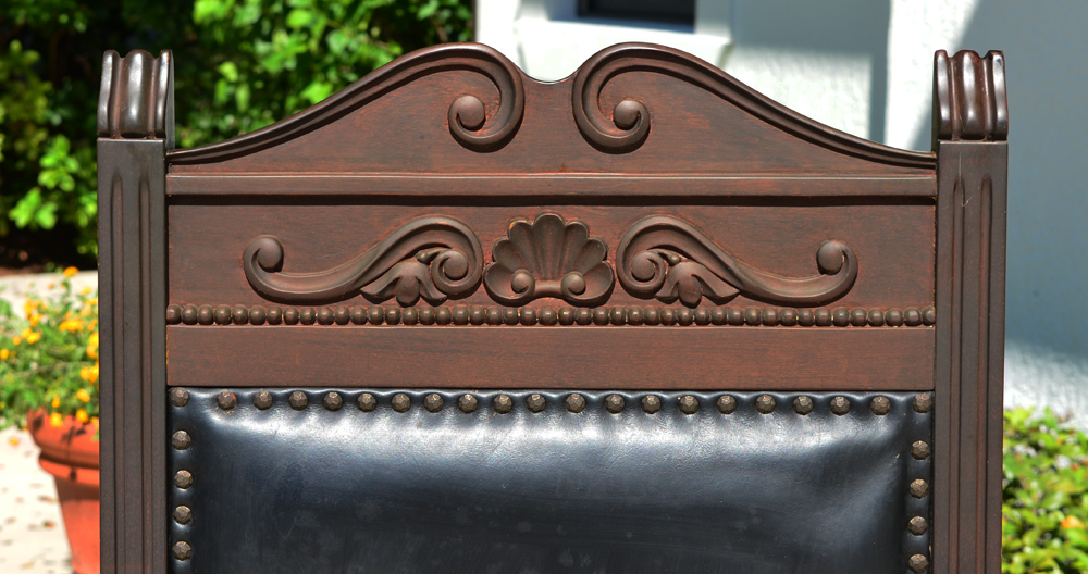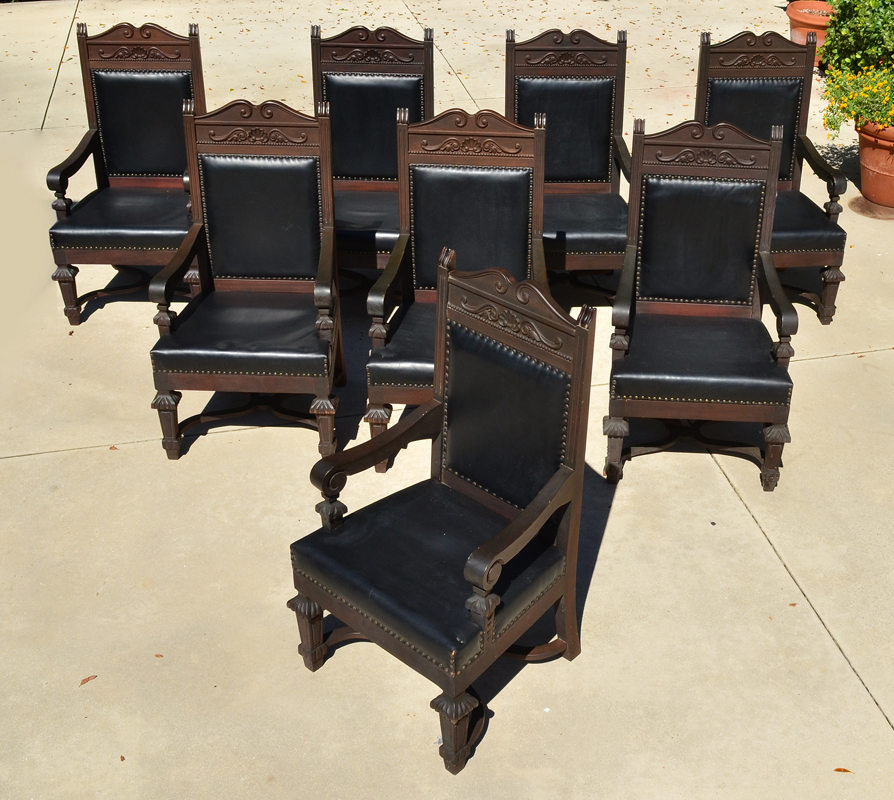 SET OF 8 CARVED SPANISH REVIVAL STYLE ARM CHAIRS: Carved and shaped top rail with applied decoration, arms with scroll hand holds, carved and tapered front legs, shaped supports. Tacked black leather upholstery on back and seats. Overall measure 47'' h. x 26 1/4'' x 25 1/4''.