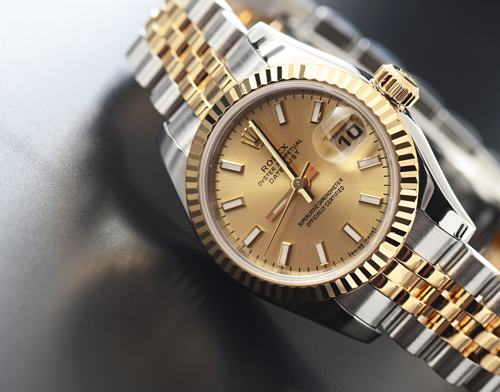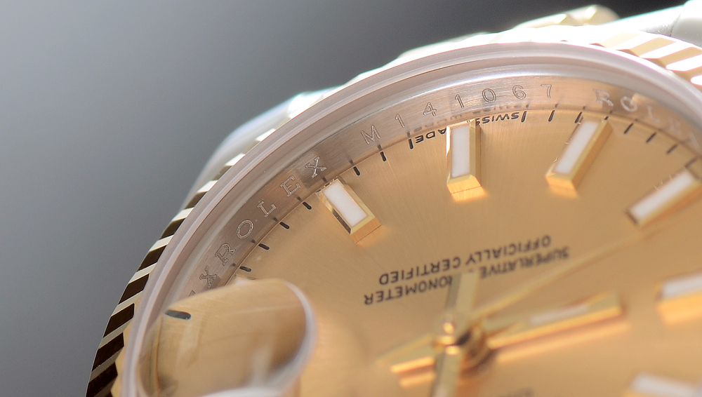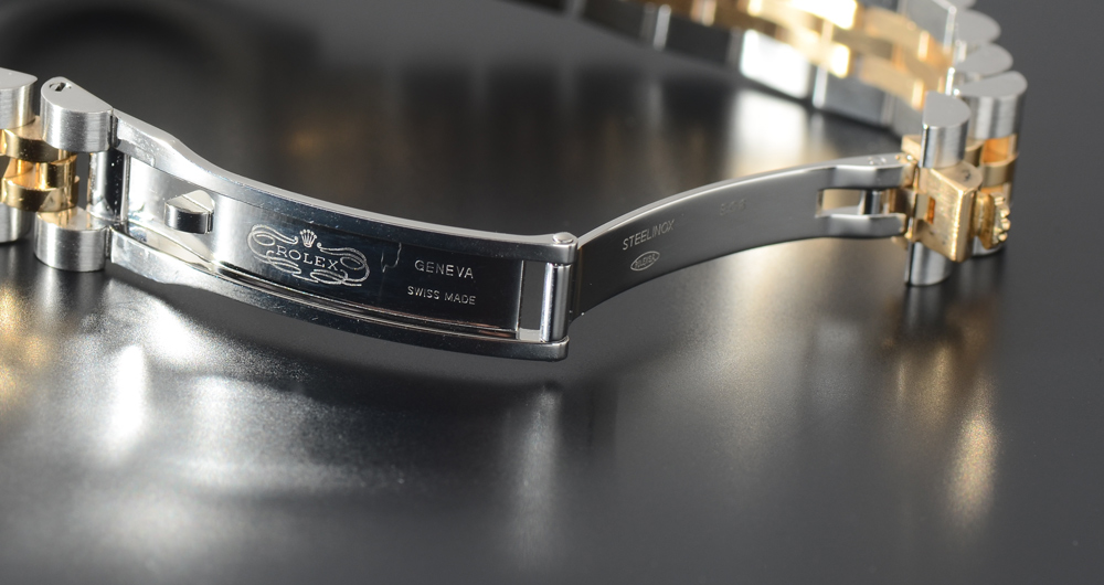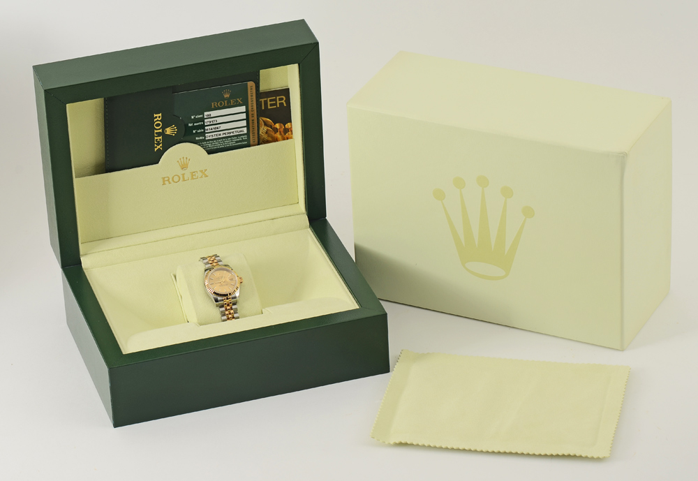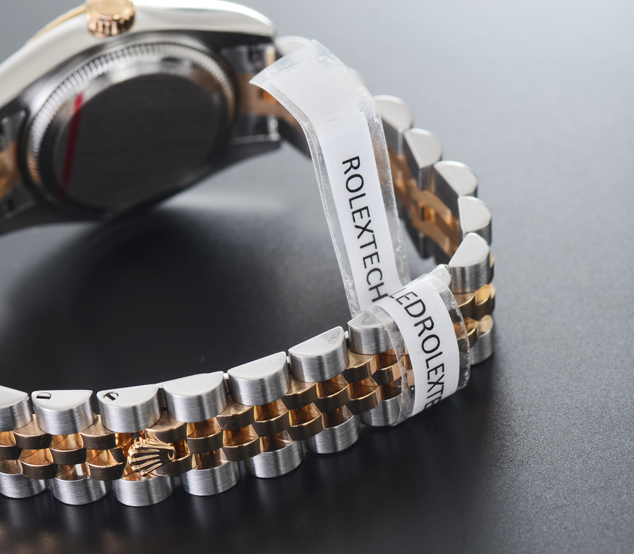 LIKE NEW LADIES ROLEX WRISTWATCH: 18K yellow gold and stainless steel two tone Oyster Perpetual watch with Jubilee bracelet. Under the bezel is a continuous engraving of ''Rolex''. The watch is like new in the box, tech sealed, with pamphlets and ID card. Inside measures 6 78'' dia.