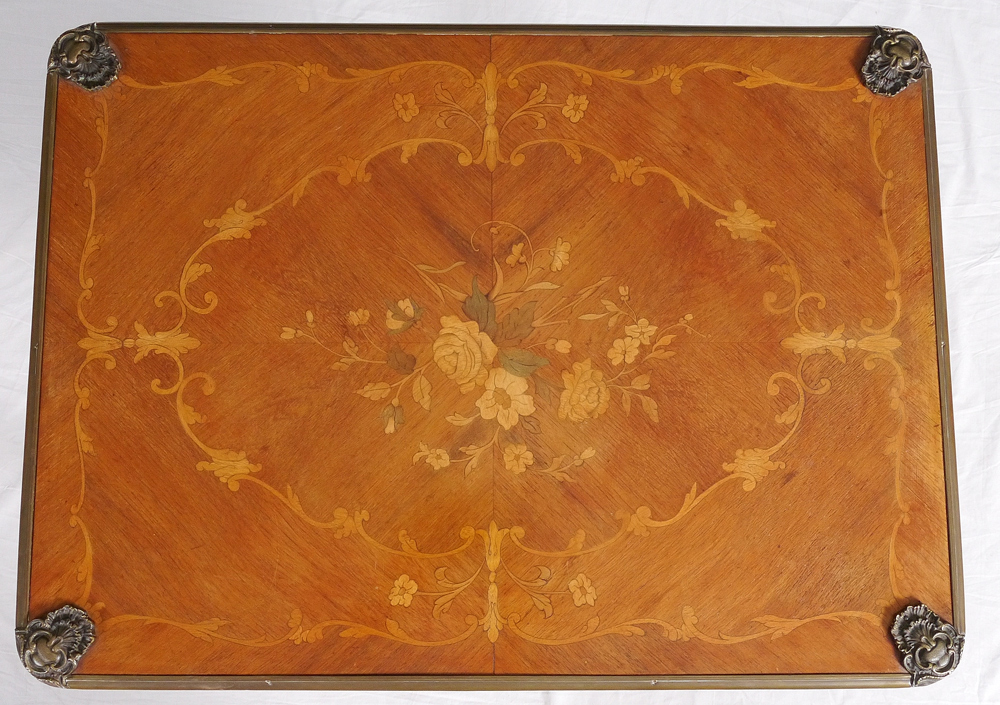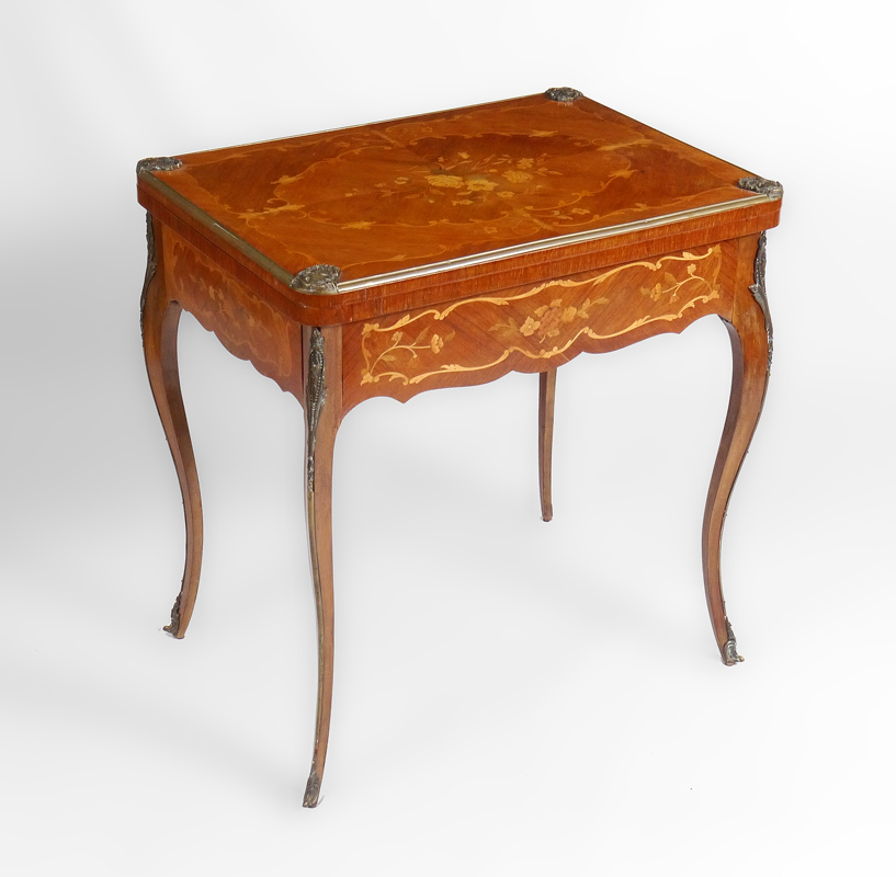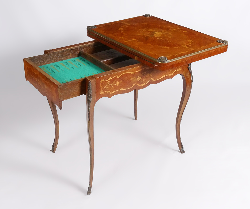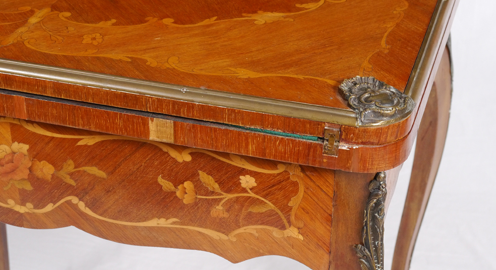 LOUIS XV STYLE MARQUETRY INLAID ORMOLU GAME TABLE: Swivel top opens to a 42.5'' x 29'' felt lined playing surface, single drawer has storage and a Backgammon board. Metal banded top with ormolu to corners, shaped aprons, cabriole legs with ormolu trim, decorative sections at top and feet. 29.5''h. x 29'' x 21.25''.