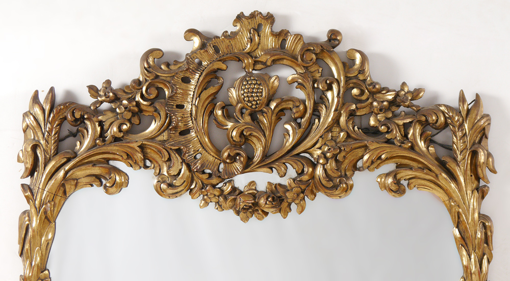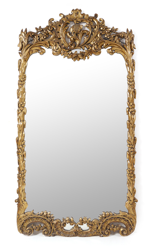 ROCOCO STYLE CARVED GILT WOOD MIRROR: Carved and pierced frame with foliate scroll motif, overall measures 59'' h. x 31 1/2'' x 11 1/2''.