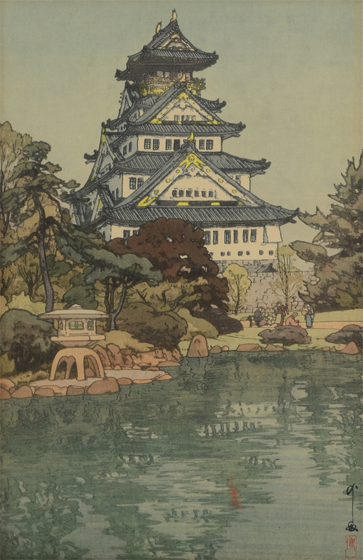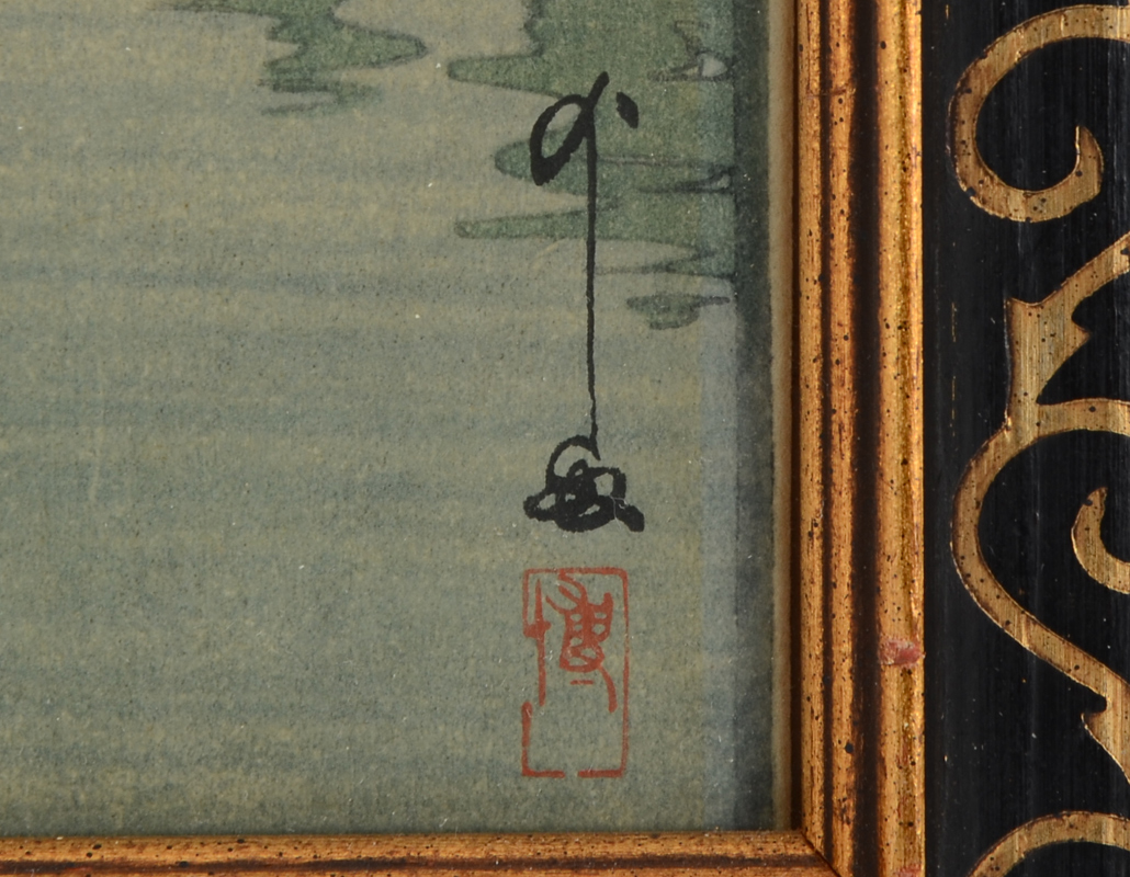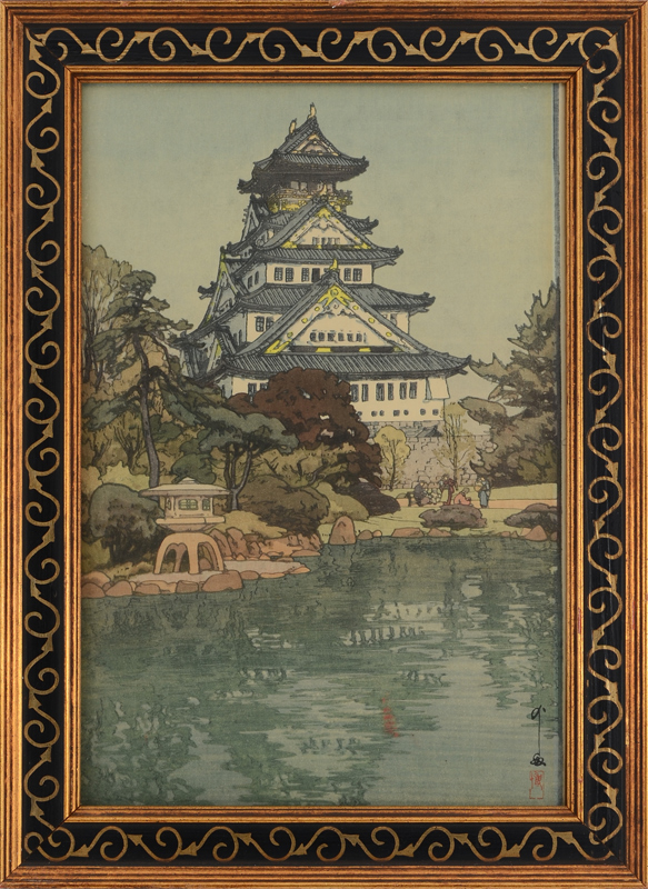 HIROSHI YOSHIDA WOODBLOCK: Temple by Pond, sight size 14 1/4'' x 9 1/2'', custom frame, 17 1/2'' x 12 3/4''.