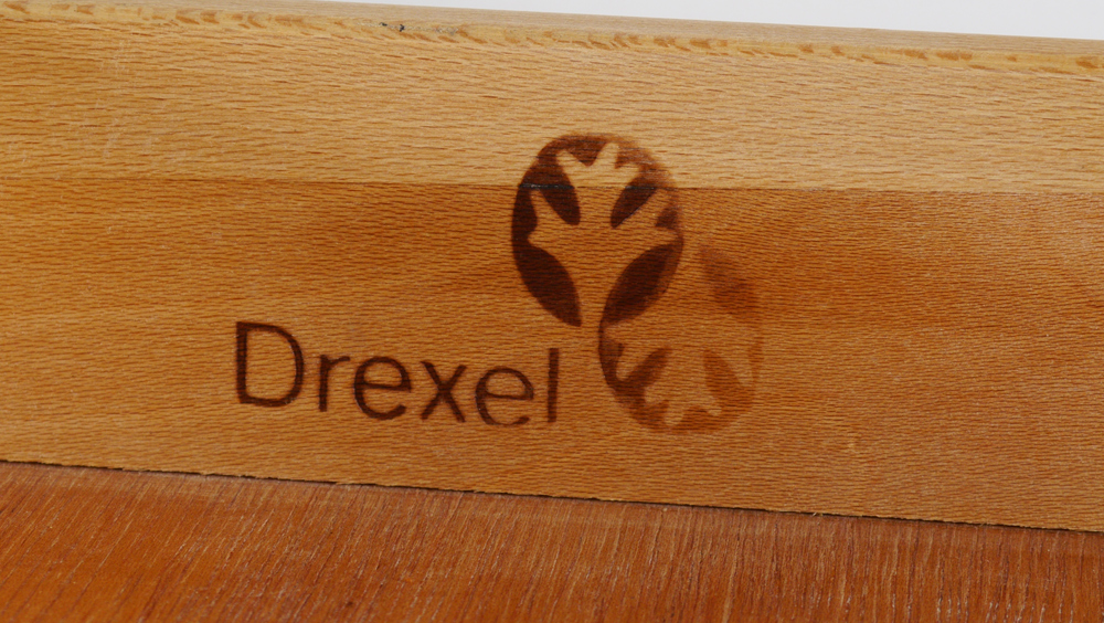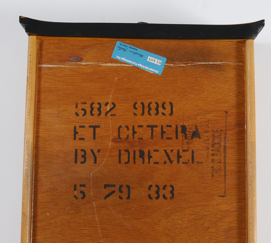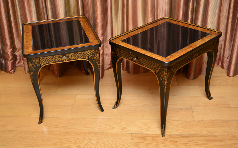 PAIR DREXEL CHINOISERIE SIDE TABLES: From the Et Cetera collection, glass inset top, chinoiserie decorated sides with single drawer, shaped legs. 22 3/4'' h. x 26'' x 21''.