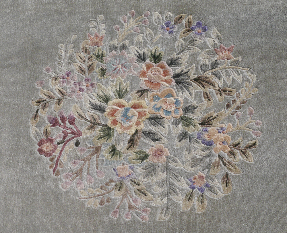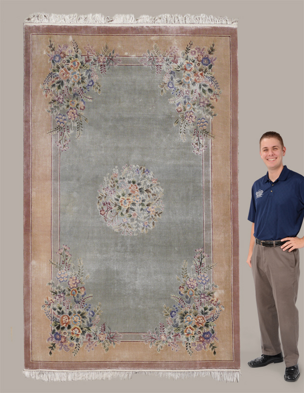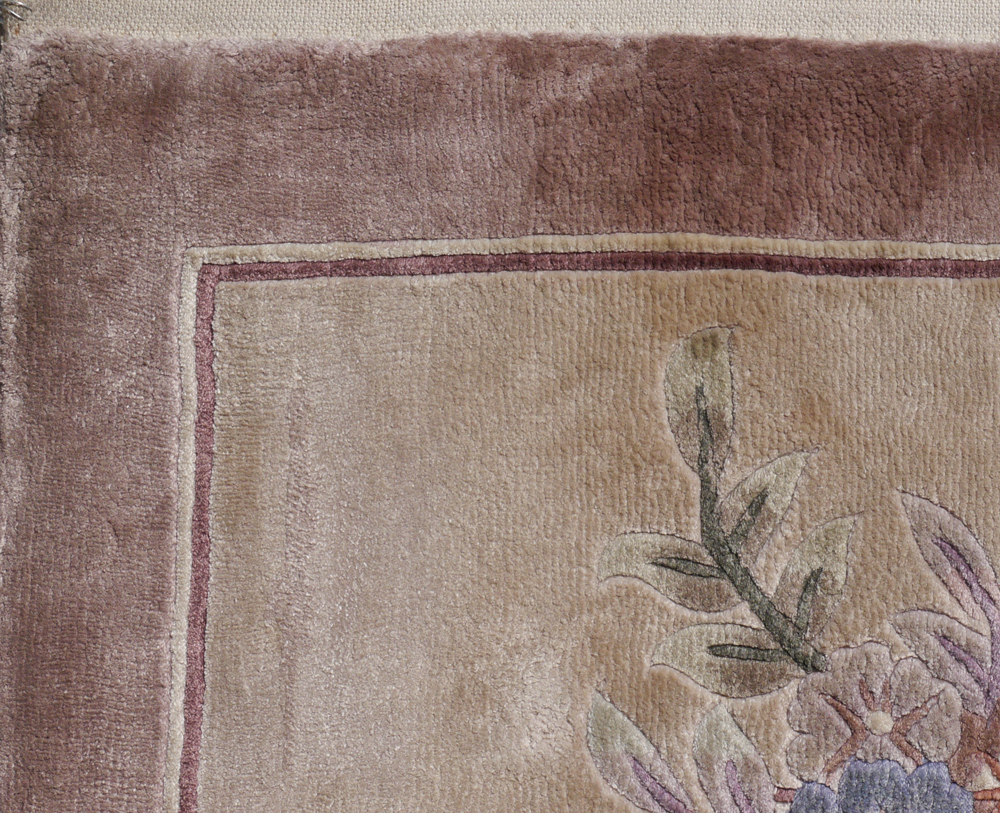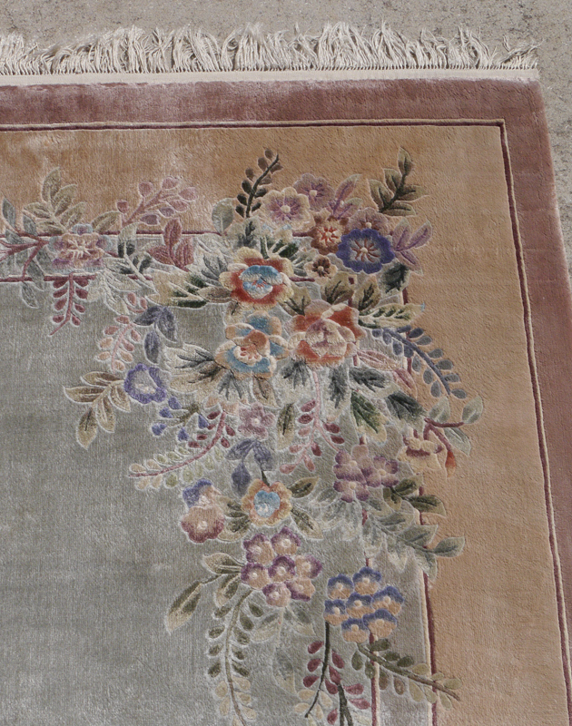 APPROX. 20-40 YR. OLD CHINESE SILK HAND KNOTTED RUG, 5'10'' x 8'11'': This modern silk rug has a soft pastel palette with a pale green field that has sprays of flowers in the center and corners of the field. The colors of the flowers and leaves include shades of blue, green, beige and brown and tie in with the colors in the borders of the rug. Original Dec 2004 purchase price $1002.50.
