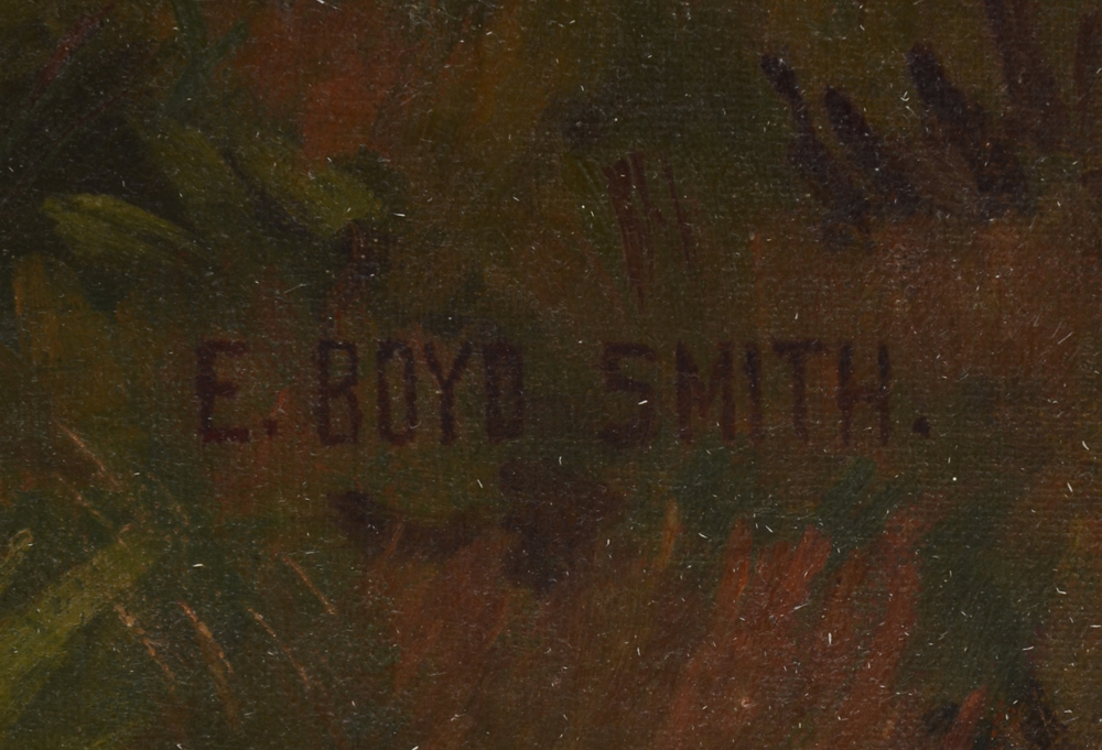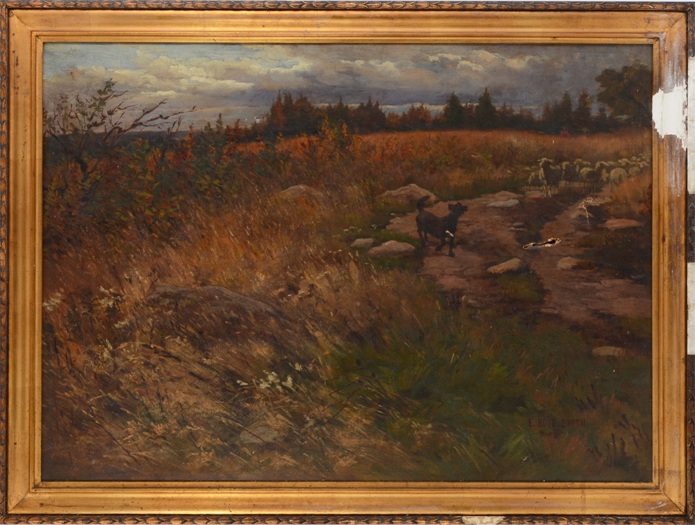SMITH, Elmer Boyd, (Canadian-American, 1860-1943): Autumnal Pastoral Landscape with a Dog & a Flock of Sheep in a Trail, Oil/Canvas, 22'' x 30'', signed lower right, gilded gesso frame 25 1/2'' x 33 1/2''.