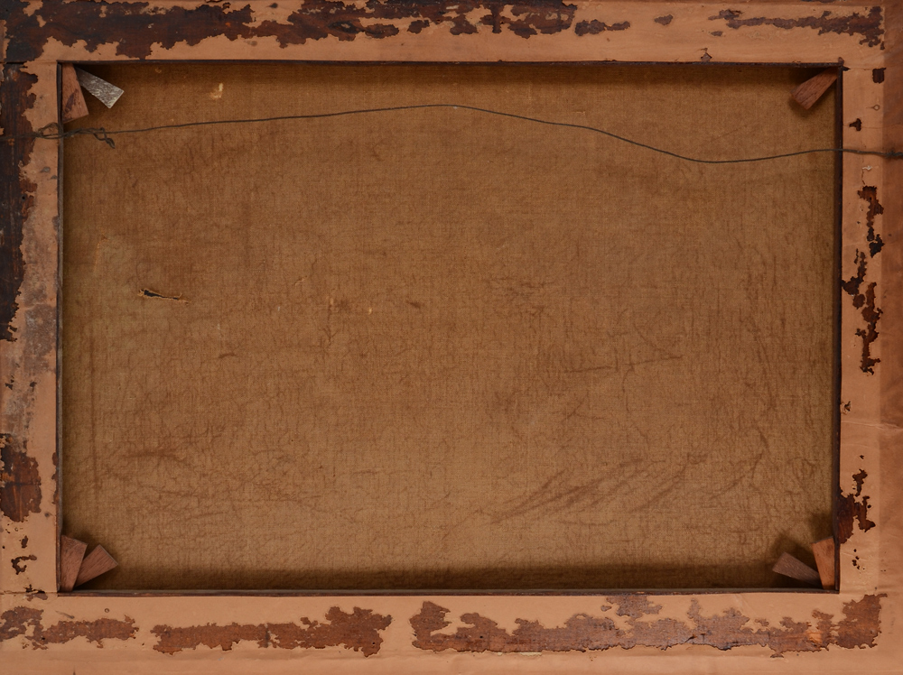 CONDITION: Frame shows loss, painting has several punctures in the upper mid margin, several in the right margin, and one in the lower right corner, needs cleaning.