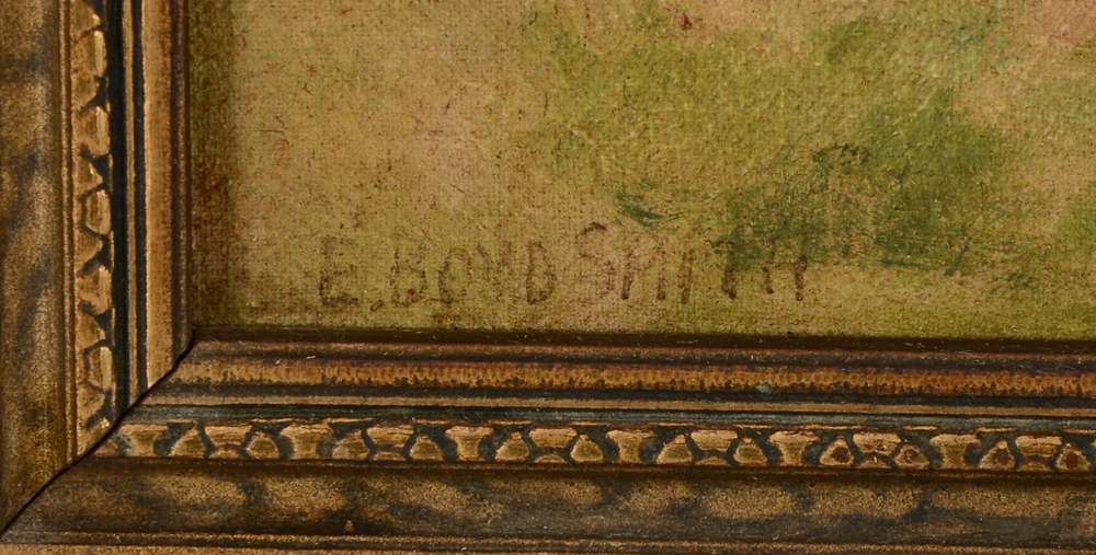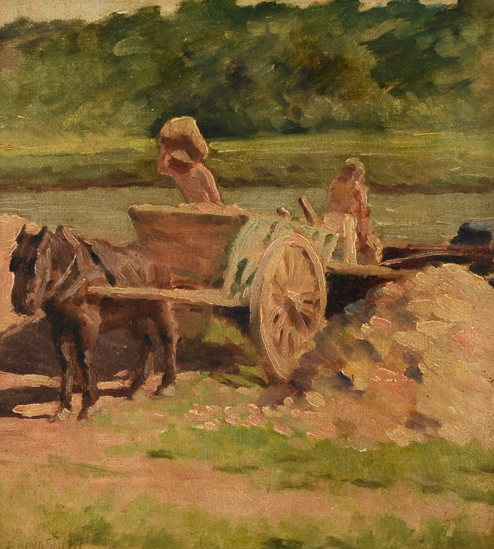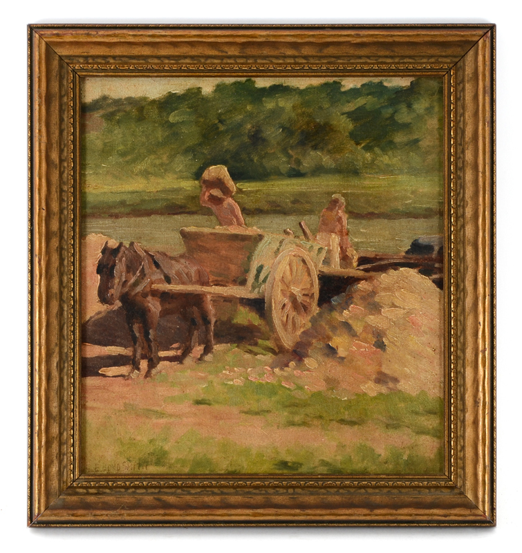 SMITH, Elmer Boyd, (Canadian-American, 1860-1943): Horse Drawn Cart Crossing a Stream, Oil/Canvas mounted to Masonite, 12'' x 11'', signed lower left, framed 14 1/4'' x 13 1/2''.