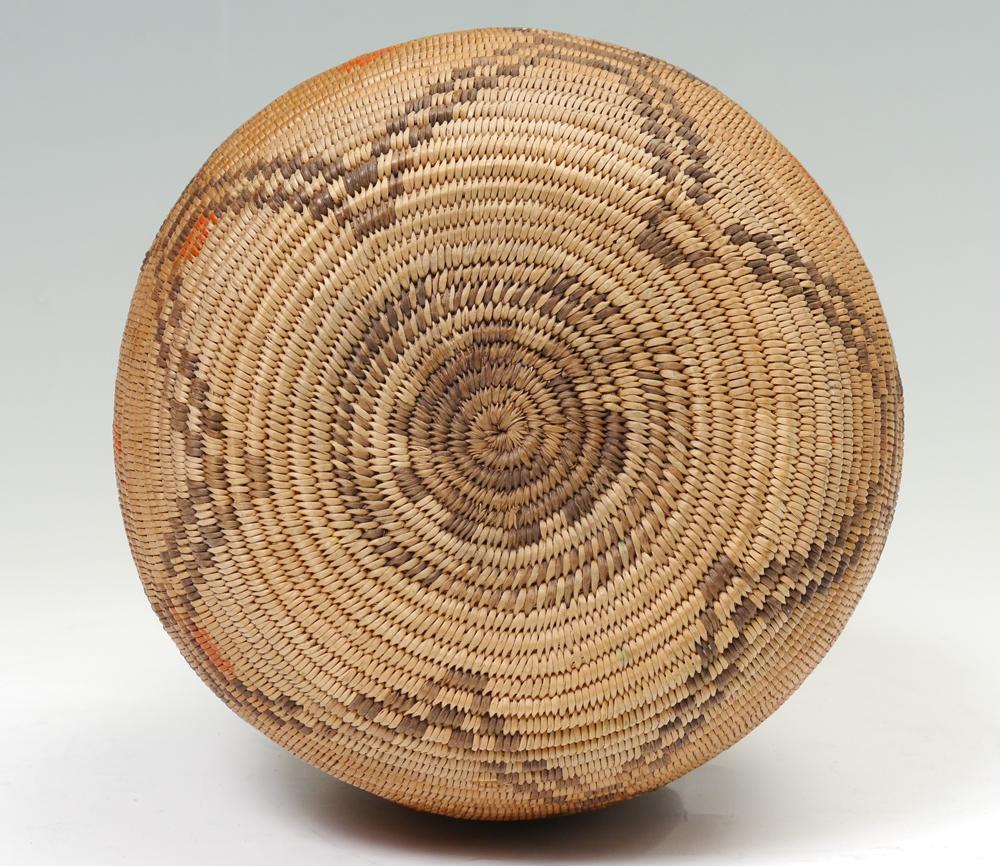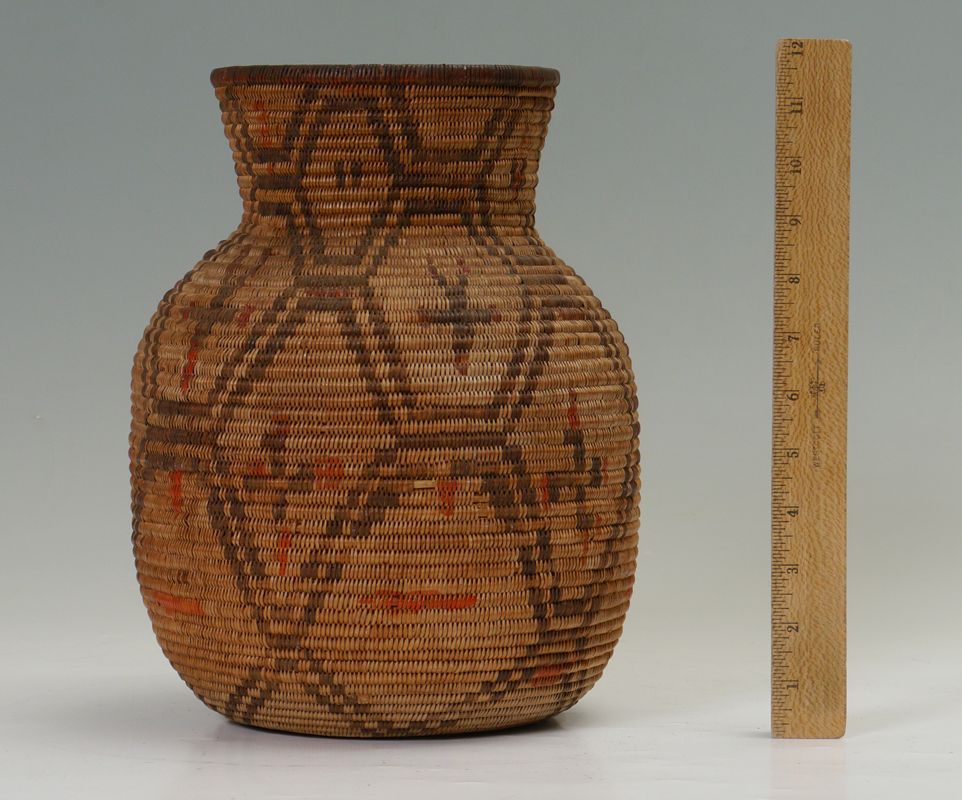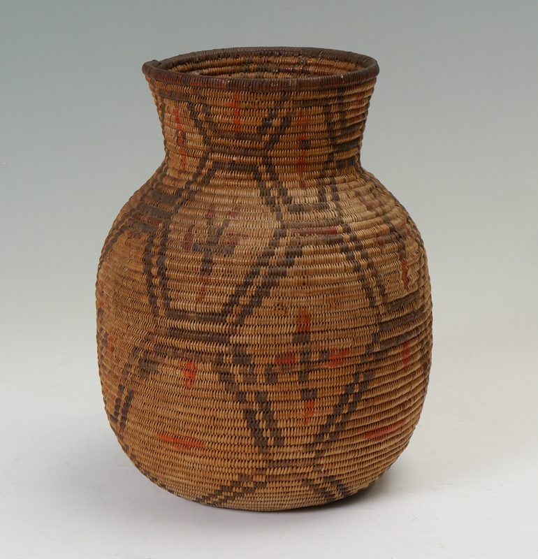 EARLY 20TH CENTURY APACHE OLLA BASKET: Repeating geometric panels with whirling logs, stylized figures and more polychrome decoration, circa 1900. Overall measures 11 3/4'' h. x 8 1/2''.