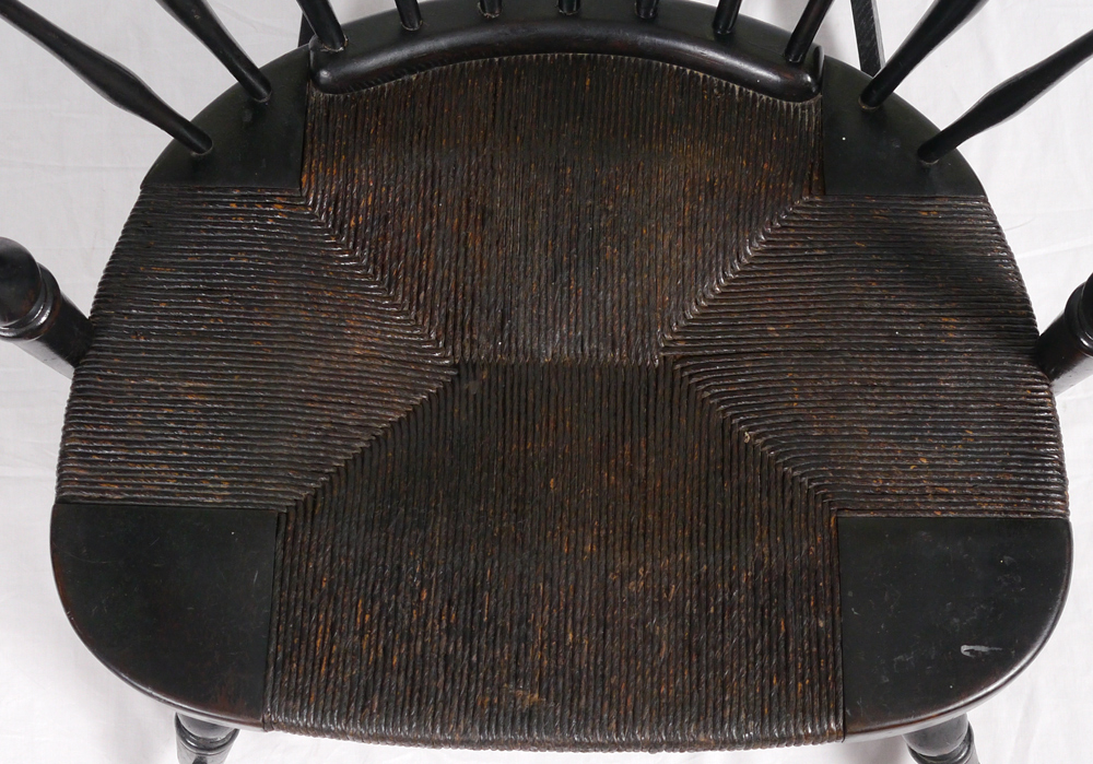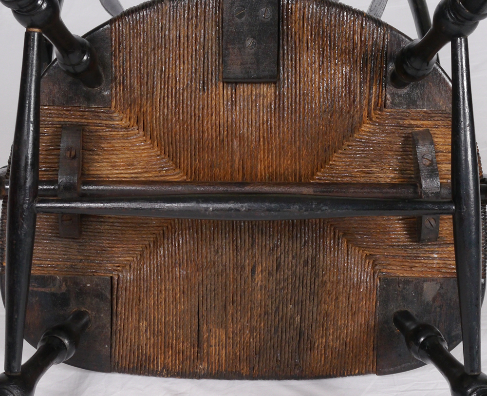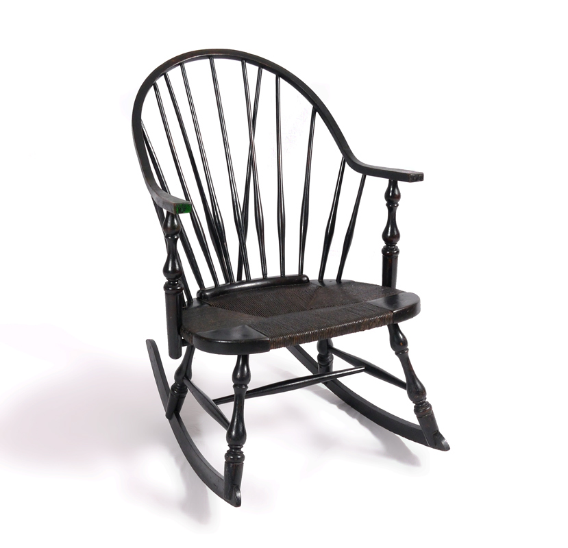 WINDSOR BOW BACK ROCKER: Black painted frame with traces of green paint on one hand hold, rush seat, overall 34 1/4'' x 20 3/4'' x 25''.