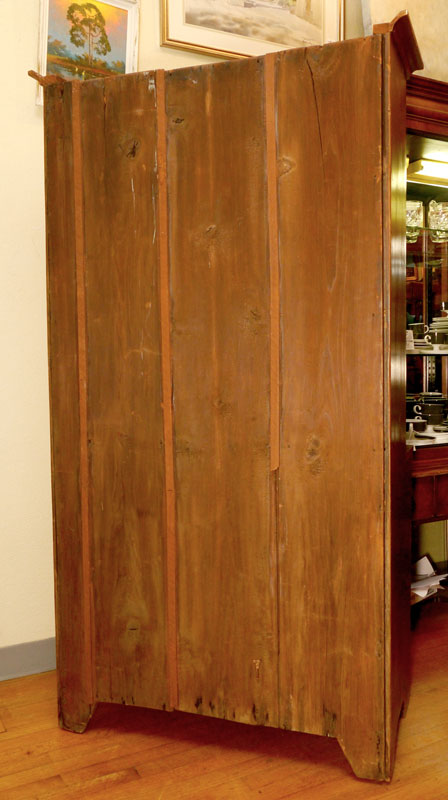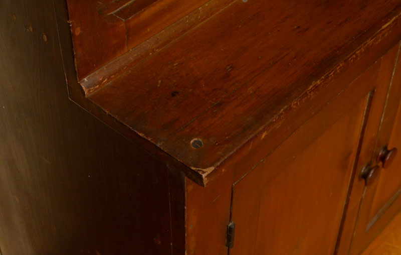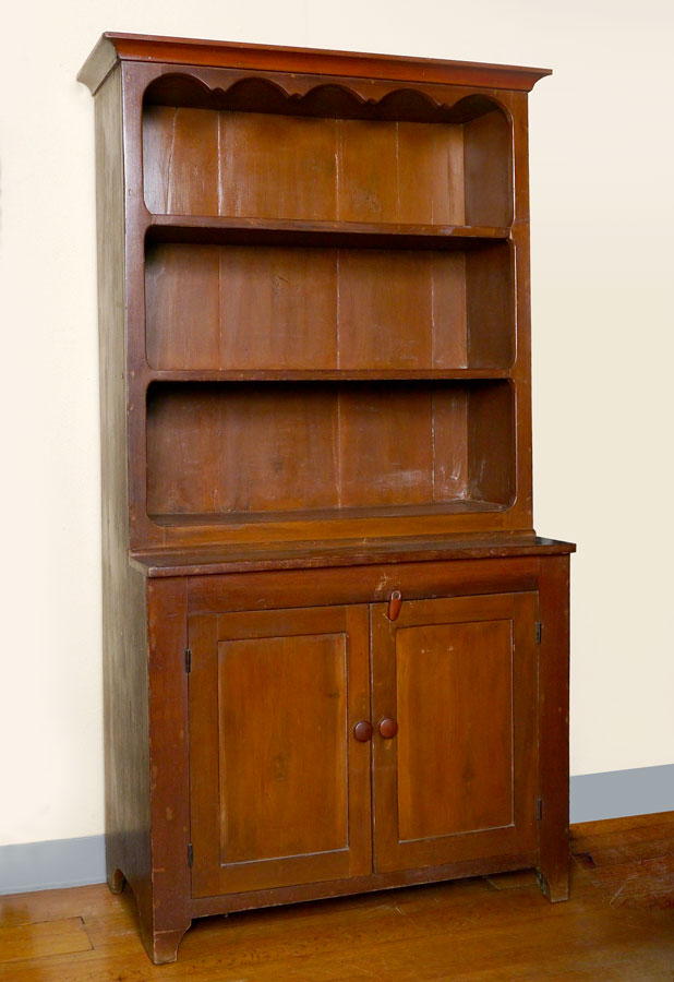 EARLY PINE STEP BACK CUPBOARD: First half 19th century, top with shaped gallery, 3 open shelves. 2 door base with single shelf, overall 67'' h. x 34'' x 18 3/4''.