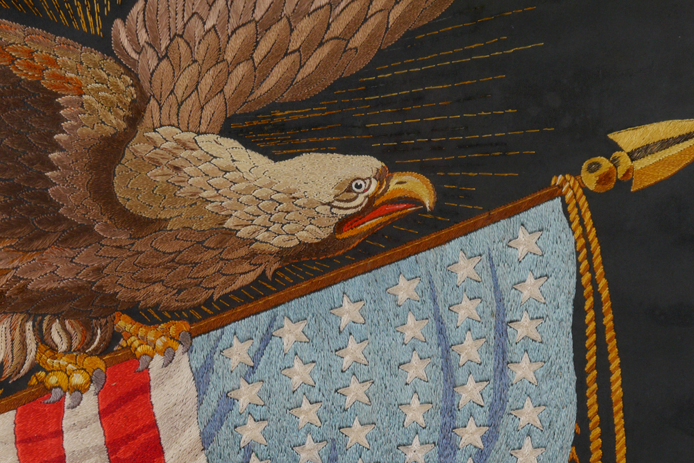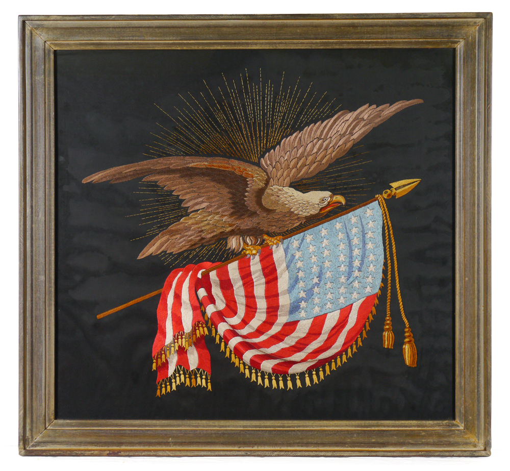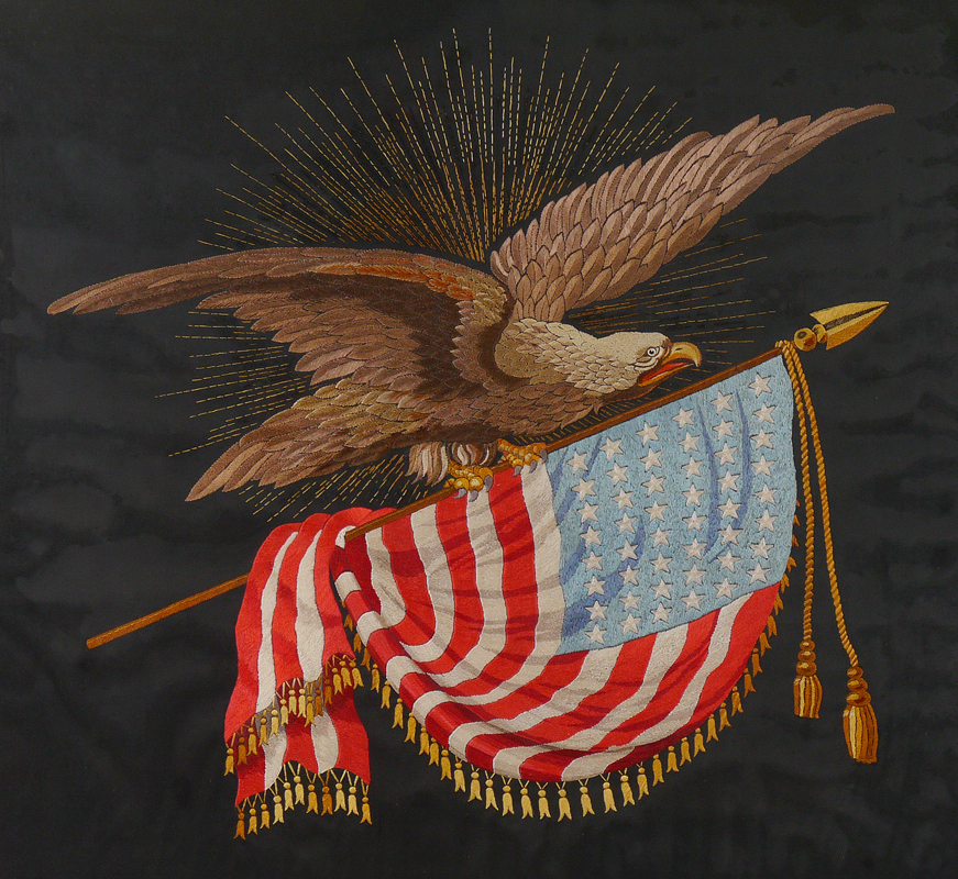 CHINESE EXPORT SILK EAGLE PATRIOTIC EMBROIDERY: Turn of the century, eagle in flight gripping a 48 star flag attached to a flag pole, rays of light emanating from behind the eagle. Sight size 21'' x 22 1/4'', framed 24 3/4'' x 26 3/4''.