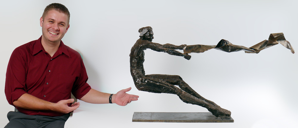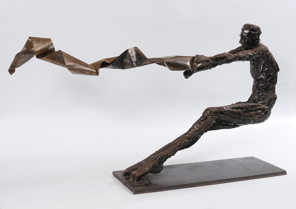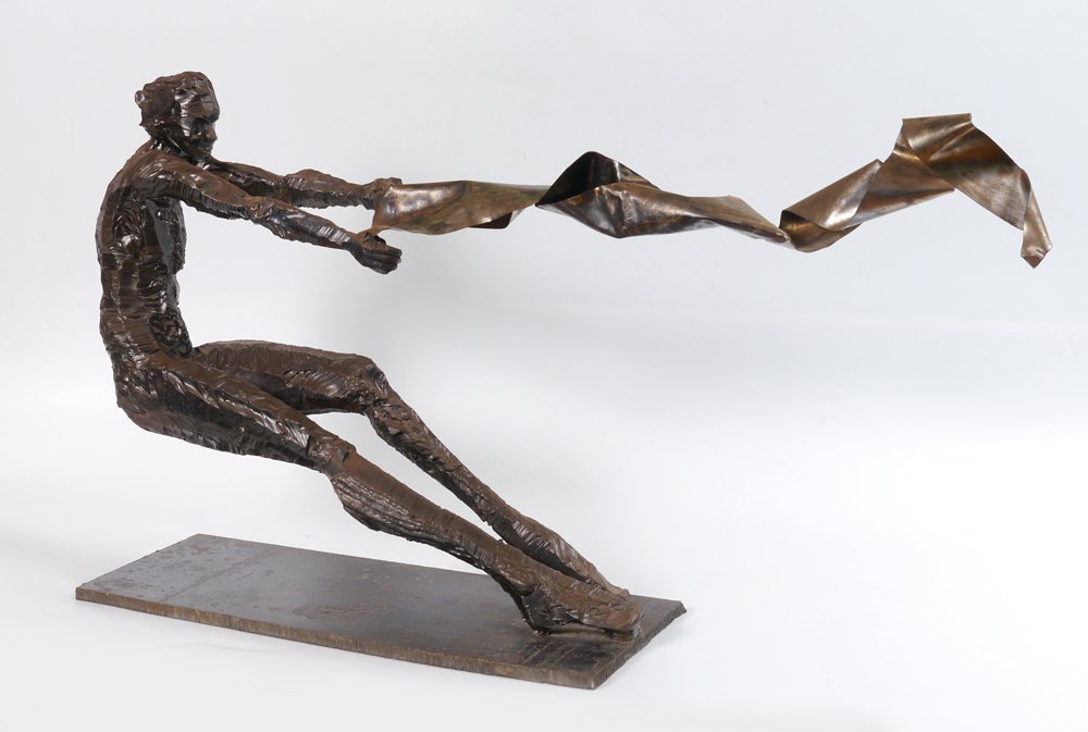 MASSIVE ABSTRACT FIGURAL HAND CUT STEEL SCULPTURE: Probably purchased at the Temple Beth El Art Festival for thousands of dollars, artist unknown, measures 25'' h. x approximately 44'' w. x 11'' d., illegibly inscribed monogram, this sculpture has been welded and hand cut, affixed to a 3/4'' thick cut steel base, from the estate of Harvey Hertz.
