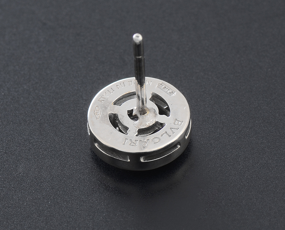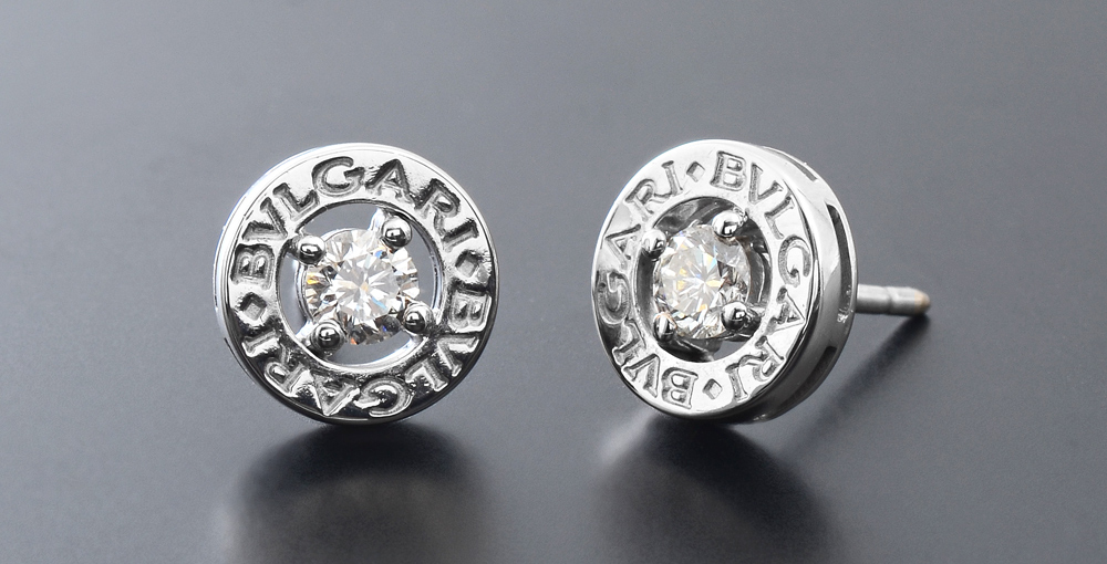 SIGNED BVLGARI DIAMOND STUD EARRINGS 18K white gold diamond solitaire Bvlgari logo earrings. These white diamonds total approx. .40 CTW. are rated VVS in clarity and E-F n color. Signed: Bvlgari. Post and nut closures. Weight: 4.2 grams.
