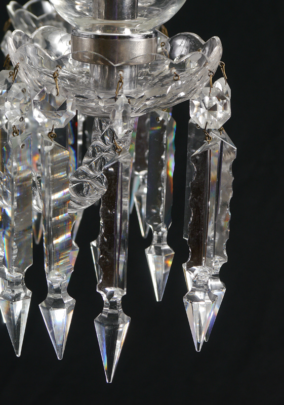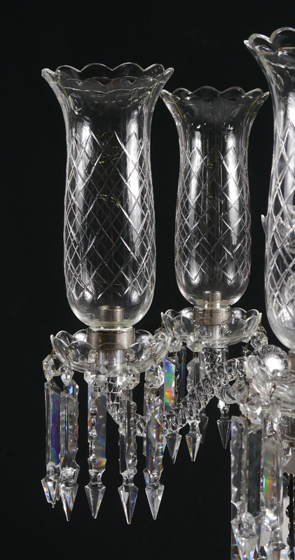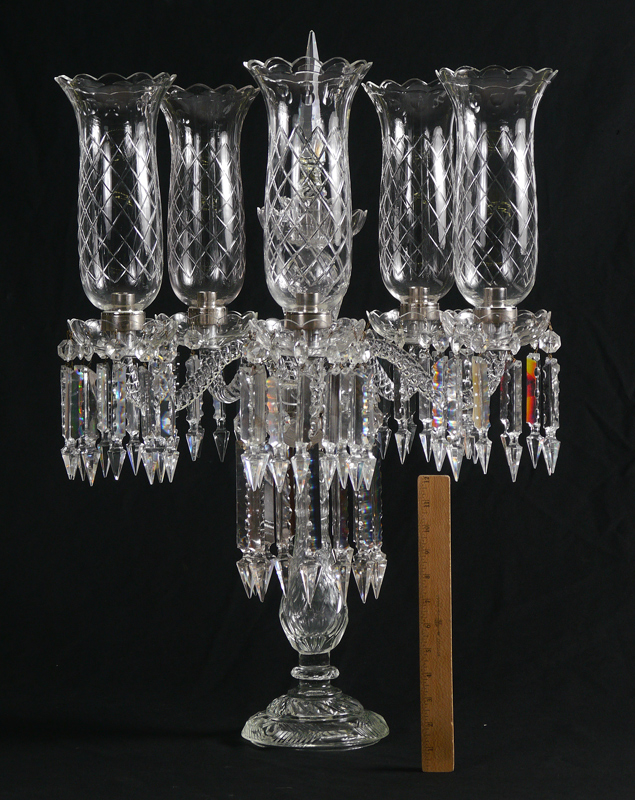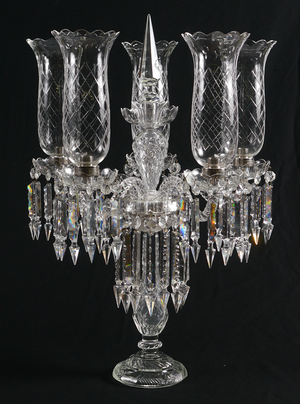 A MOST ELEGANT CUT CRYSTAL TABLE TOP CHANDELIER: 5 light bent arm candelabra dripping in cut prisms, each light with a hurricane shade cut in a cross hatch design. Overall measures 30'' tall x 21'' wide. Shades are 10.5'' tall.