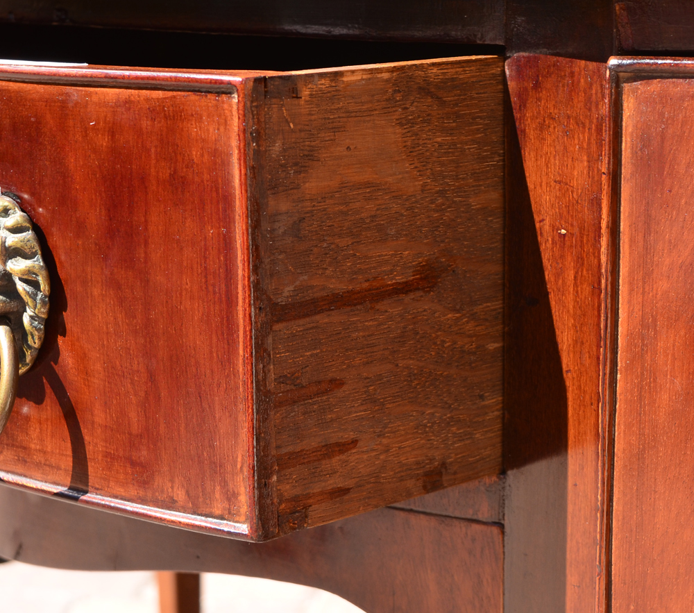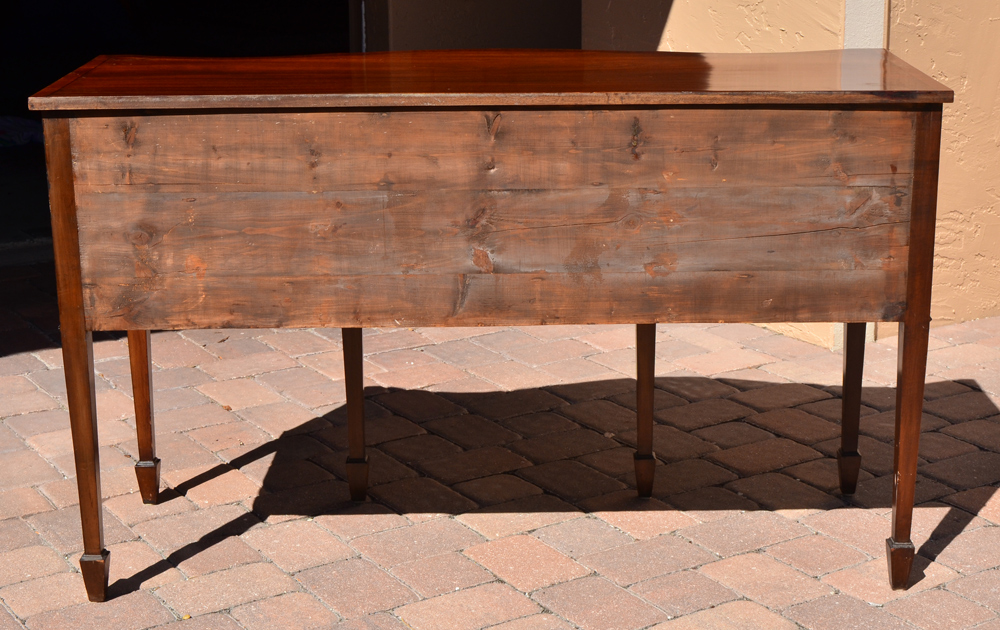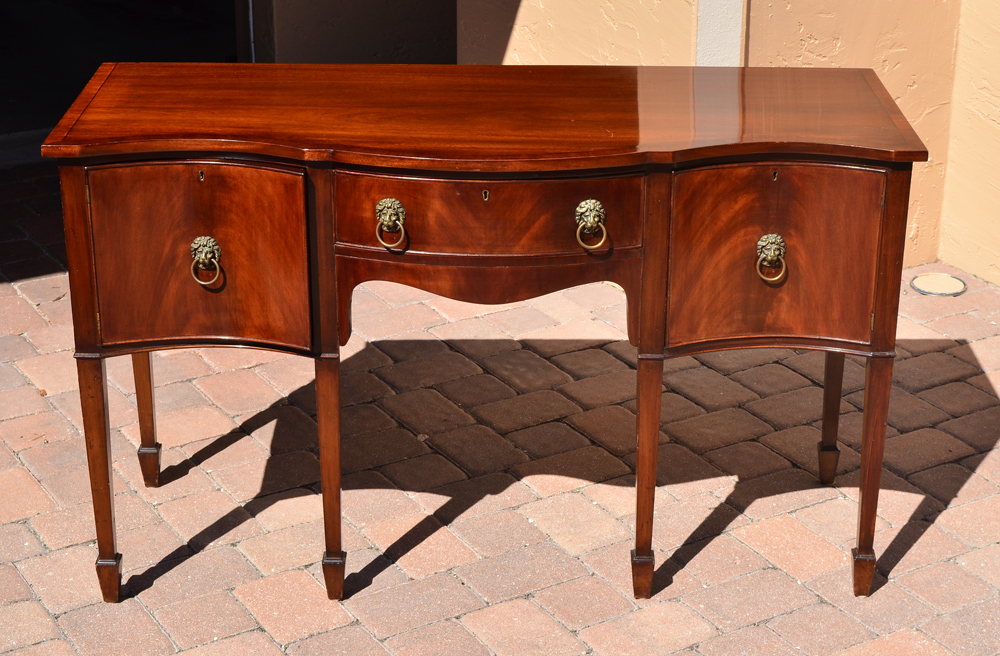 SHERATON STYLE 19TH CENTURY MAHOGANY SIDEBOARD: Serpentine top and front with single drawer, door on either side, cast brass lion masqueron pulls, tapered legs. 36'' h. x 60 1/4'' x 24 1/4''.
