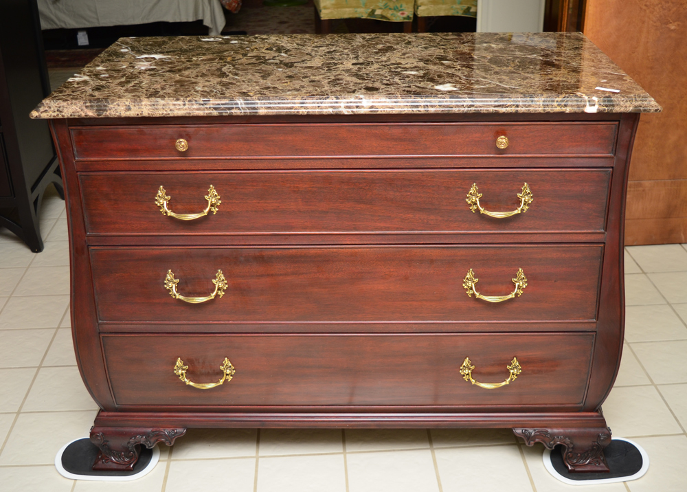HENKEL HARRIS MARBLE TOP CHEST OF DRAWERS: Brown variegated marble top, shaped base with 4 graduated drawers, brass pulls. Carved and shaped feet. Overall measures 34'' h. x 46'' x 23''.