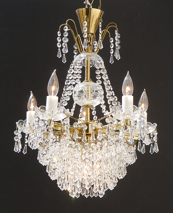 LATE 20TH CENTURY CZECHOSLOVAKIAN PRECIOSA CRYSTAL 5 LIGHT CHANDELIER: With a plated brass frame profusely hung with faceted tear-drop prisms and swaged crystal beads, the central support has a cut crystal ball, each arm has a cut crystal bobeche; 24 h x 18'' diameter. For a pair, see next lot 1164.