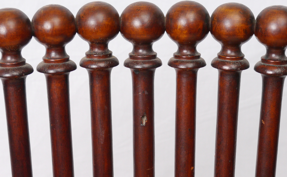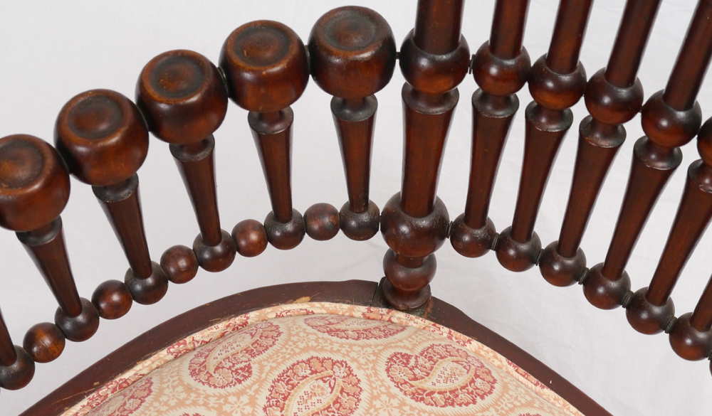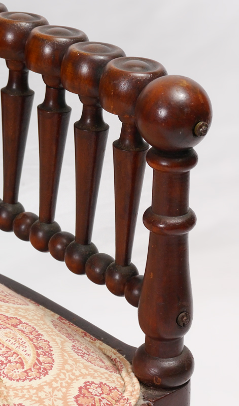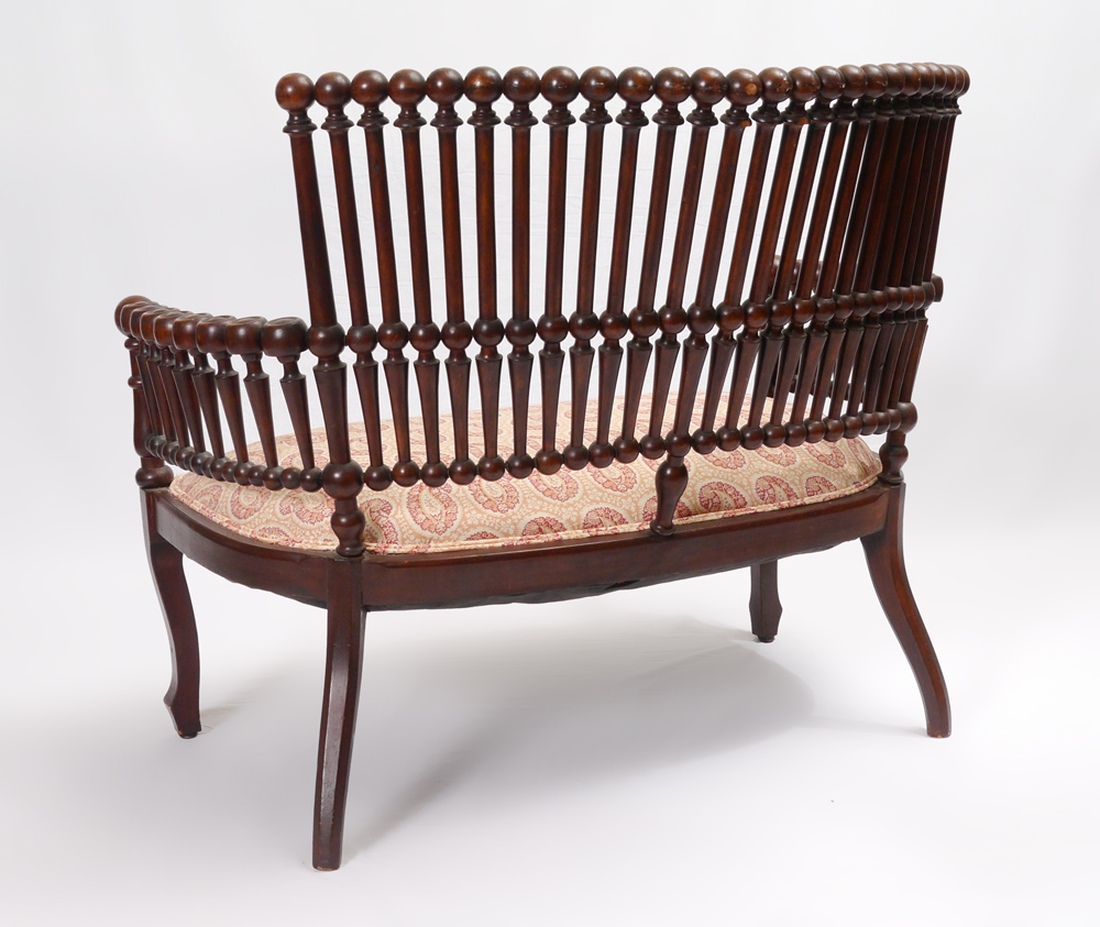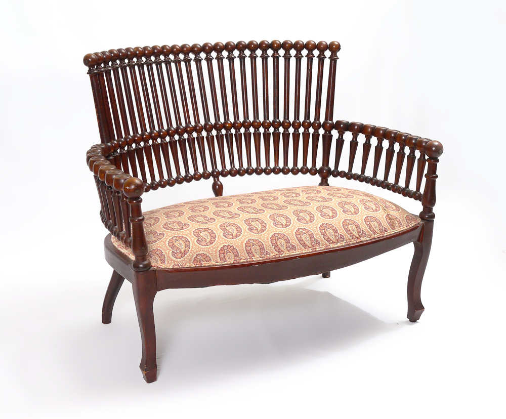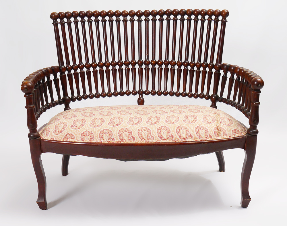 HUNZINGER LOLLIPOP DROP ARM SETTEE: Frame in the classic Lollipop style by Hunzinger, shaped legs, paisley upholstery. Measures 32 1/2'' h. x 39'' x 27''.