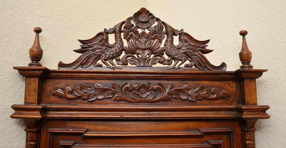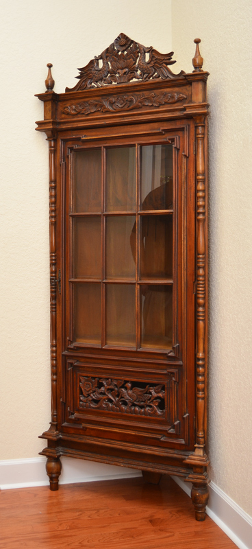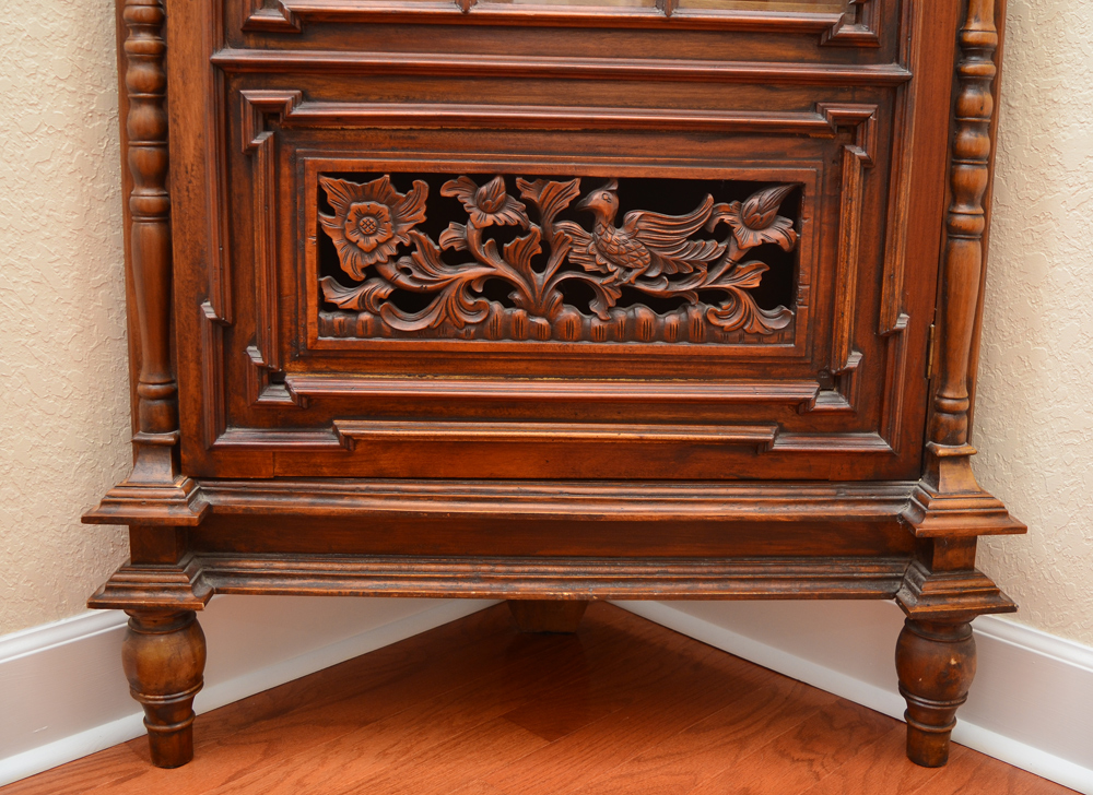CARVED VICTORIAN CORNER CABINET: Pierced carved pediment with bird and floral motif, case with applied decoration. 9 light door with bird motif pierced carved panel, turned front legs. Overall measures 83 1/2'' h. x 34'' x 16''.