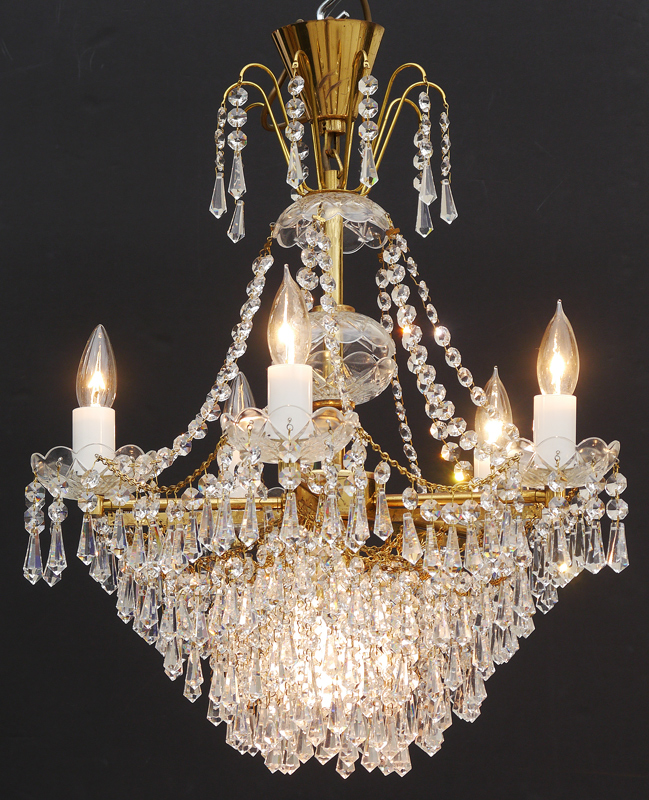 LATE 20TH CENTURY CZECHOSLOVAKIAN PRECIOSA CRYSTAL 5 LIGHT CHANDELIER: With a plated brass frame profusely hung with faceted tear-drop prisms and swagged crystal beads; the central support has a cut crystal ball, each arm has a cut crystal bobeche; 25'' h. x 18'' diameter.