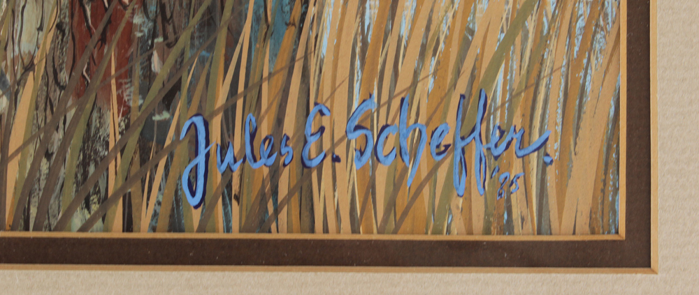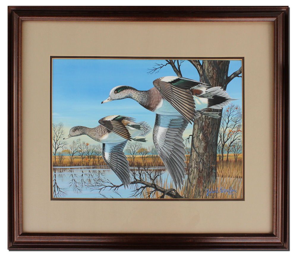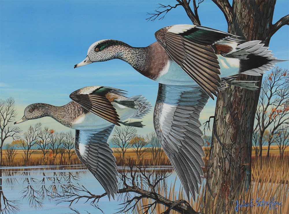 SCHEFFER, Jules E., (American, 1924-2006): Male & Female Green Winged Teal Ducks in Flight, Gouache, Sight size 12 3/4'' x 17 3/4'', signed lower right, dated '86, framed 23'' x 27''.