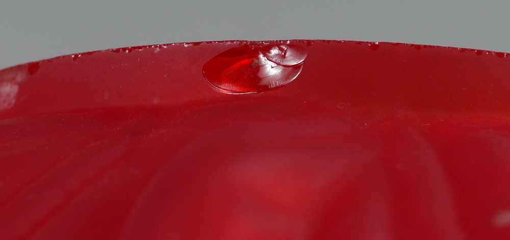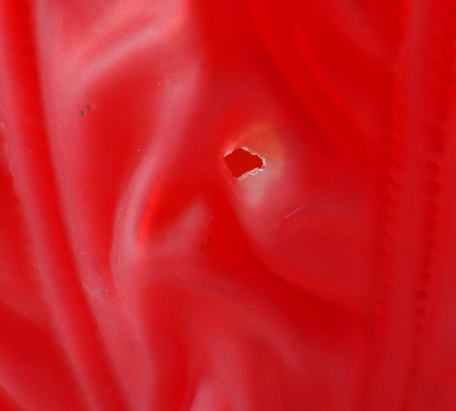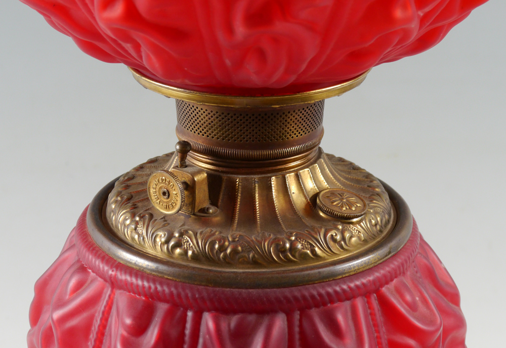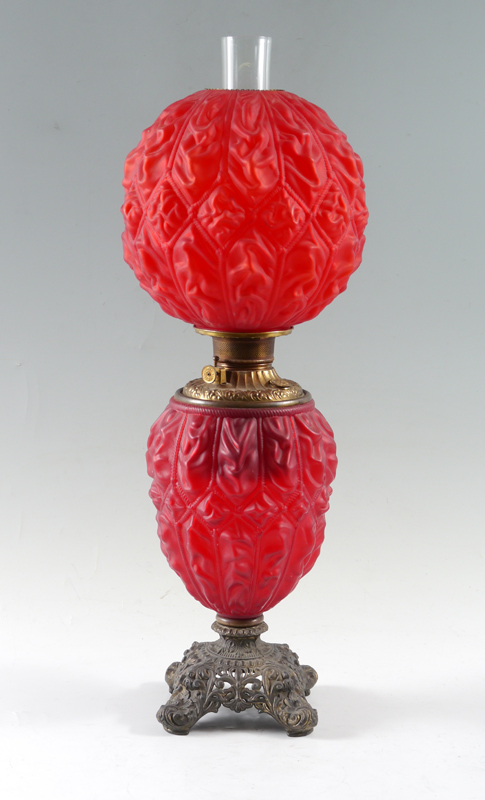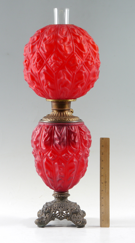 RED SATIN GLASS GONE WITH THE WIND OIL LAMP: A rich red drape pattern globe and base, the thumb wheel is impressed Made in America. Approx. 28'' tall., the globe approx. 11'' dia.