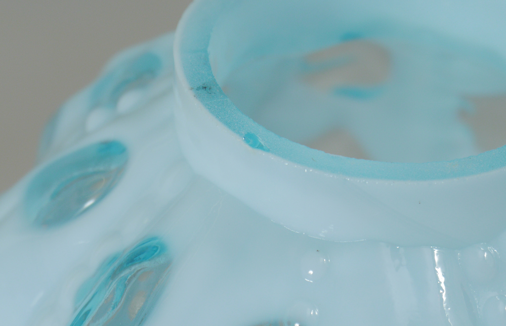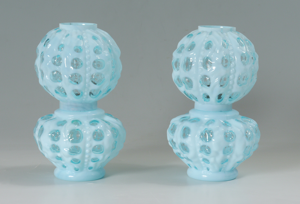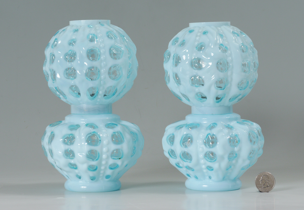 PAIR MINIATURE BLUE OPALESCENT OIL LAMPS: Reverse thumbprint matching shade and base, original collar. Measures approx. 8'' tall, the globe 5''.