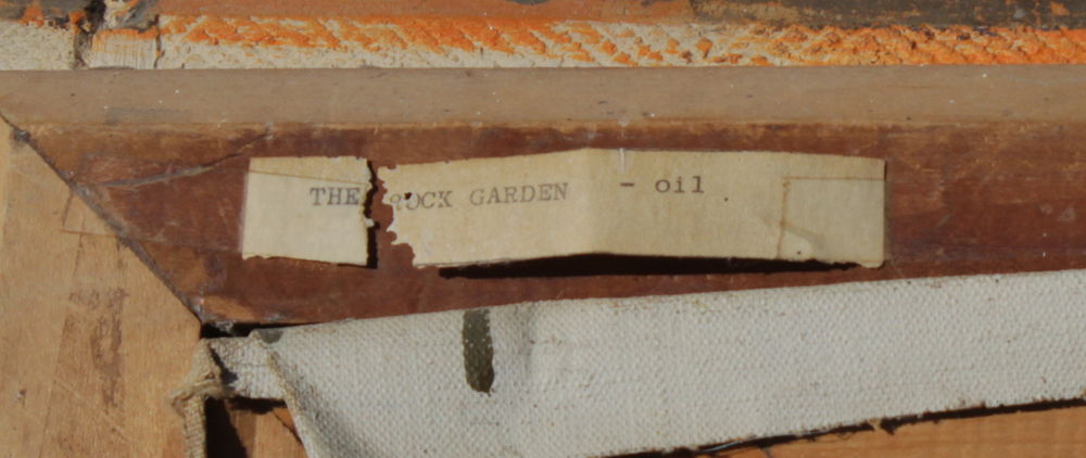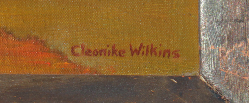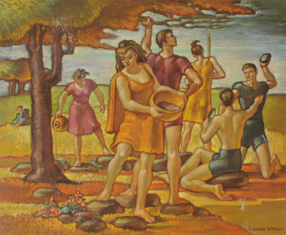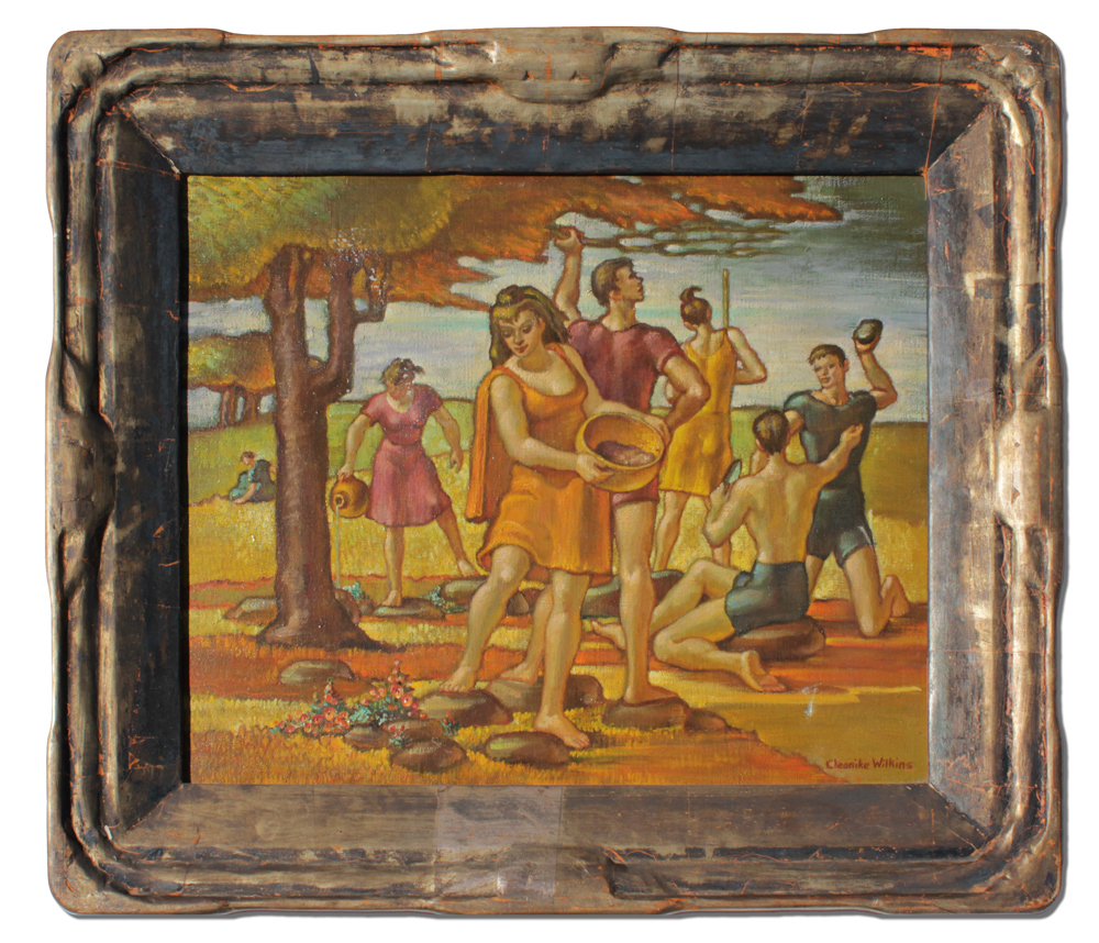 WILKINS, Cleo, (American, 1895-1979): ''The Rock Garden'', WPA Style Scene with Figures, Oil/Canvas, 16'' x 20'', signed lower left, encased in period and gilded and carved gesso frame 22'' x 26 1/8'', there is an old label affixed verso with the title. Acquired from a descendant in the family.