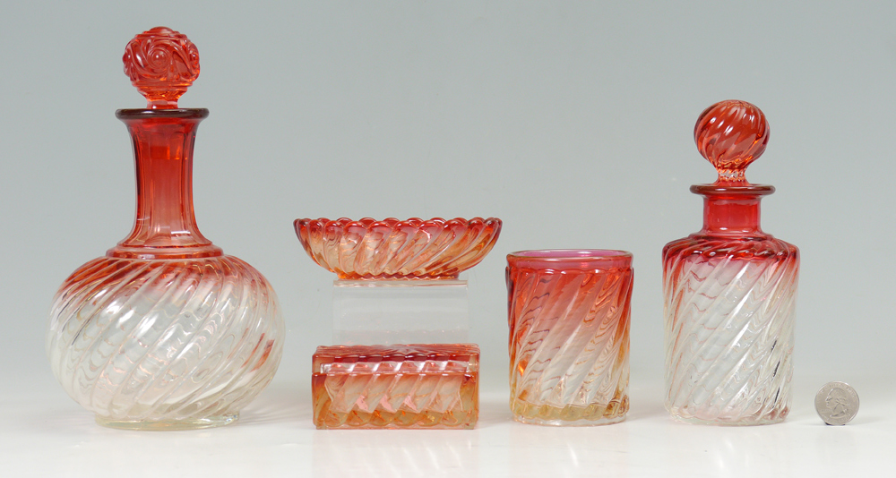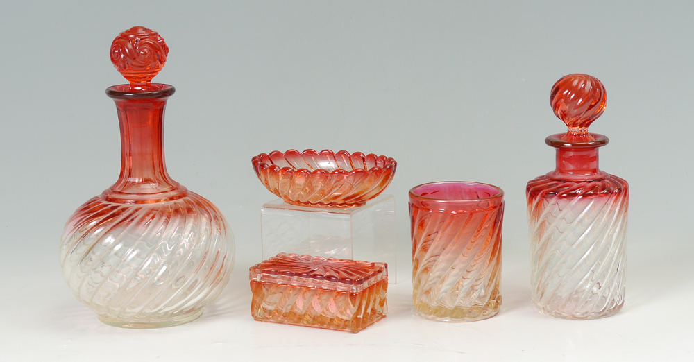 5 BACCARAT ROSE SWIRL GLASS DRESSER ITEMS: 5 pieces total to include 1) Decanter with stopper, 8 1/2'' h. x 5''. 2) Round jar with stopper, 7'' h. 3) Water glass 3 3/4''. 4) Covered rectangular box, 3 5/8'' long. 5) Open oval dish, 4 3/4''. No visible markings.