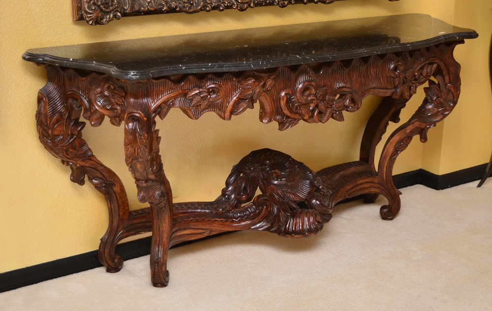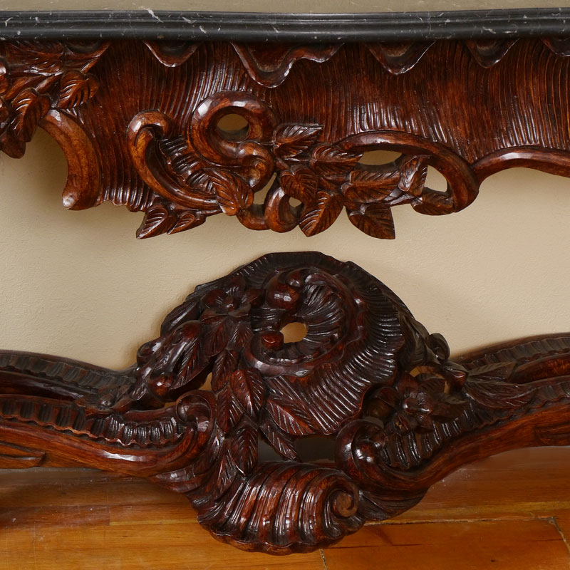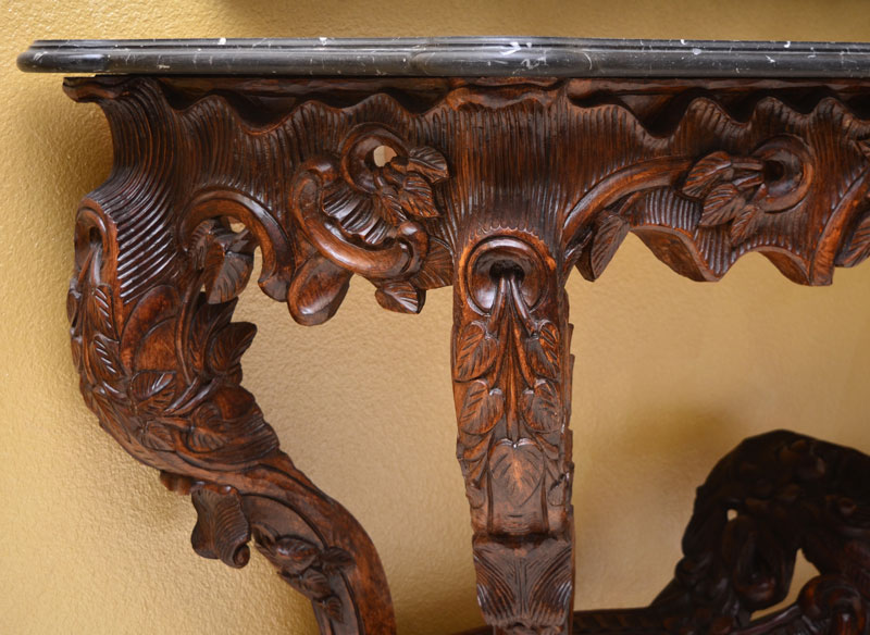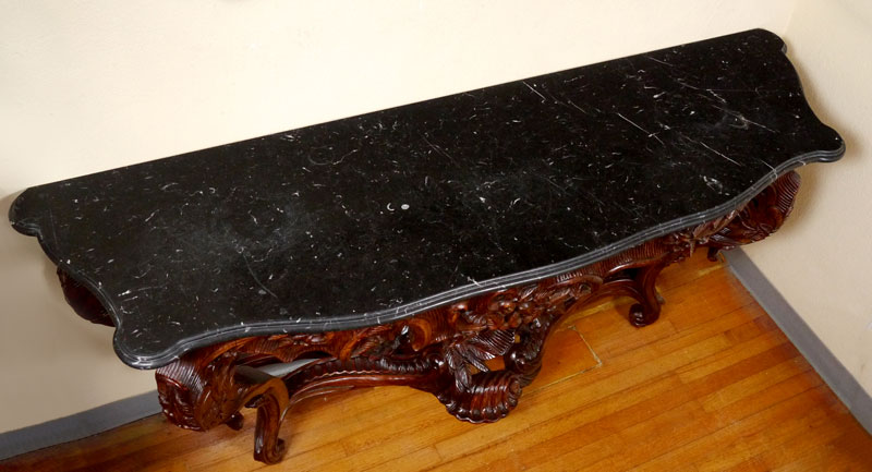MARBLE TOP CARVED CONSOLE TABLE: Shaped variegated black marble top, base profusely carved all over with foliate motifs. Overall measures 35 3/4'' h. x 78 1/2'' x 23''.