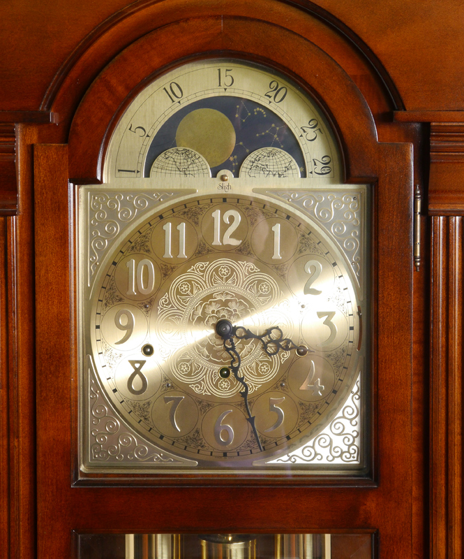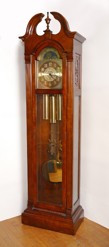 SLIGH GRANDFATHER CLOCK: Model 0941-1-AN, broken arch pediment with spire finial, mahogany veneer case, mixed metal dial with moon phase. Movement with single chime and silent. Overall measures 82'' h. x 23'' x 13''.
