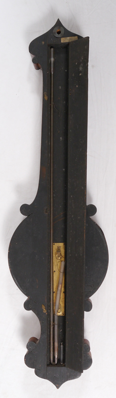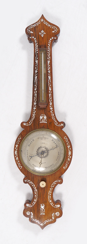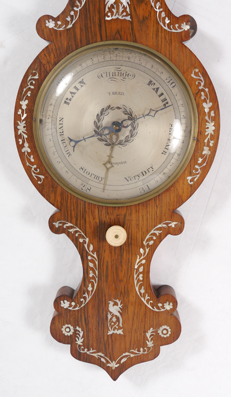 19TH CENTURY ENGLISH INLAID BANJO BAROMETER: Floral and foliate inlaid mother of pearl decoration. Thermometer with brass plaque, silvered barometer dial marked T. Reed, Hampton. Overall measures 39 1/4'' h. x 10 1/2'' x 3''.