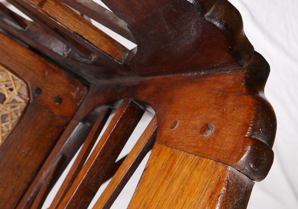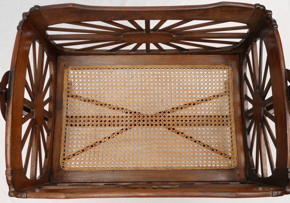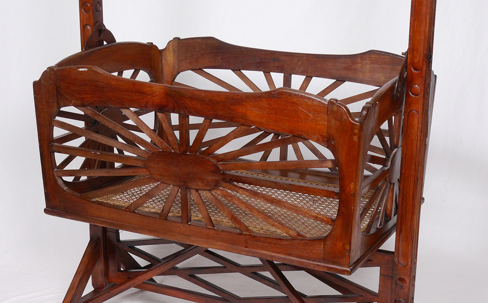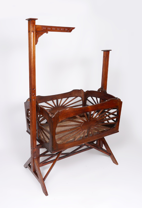 LARGE VICTORIAN HANGING BABY CRADLE: Carved supports, cradle hangs from supports by iron cleats. Cradle with starburst design on sides, woven cane bottom. Overall assembled measures 72 1/2'' h. x 43 1/4'' x 28 1/2''.