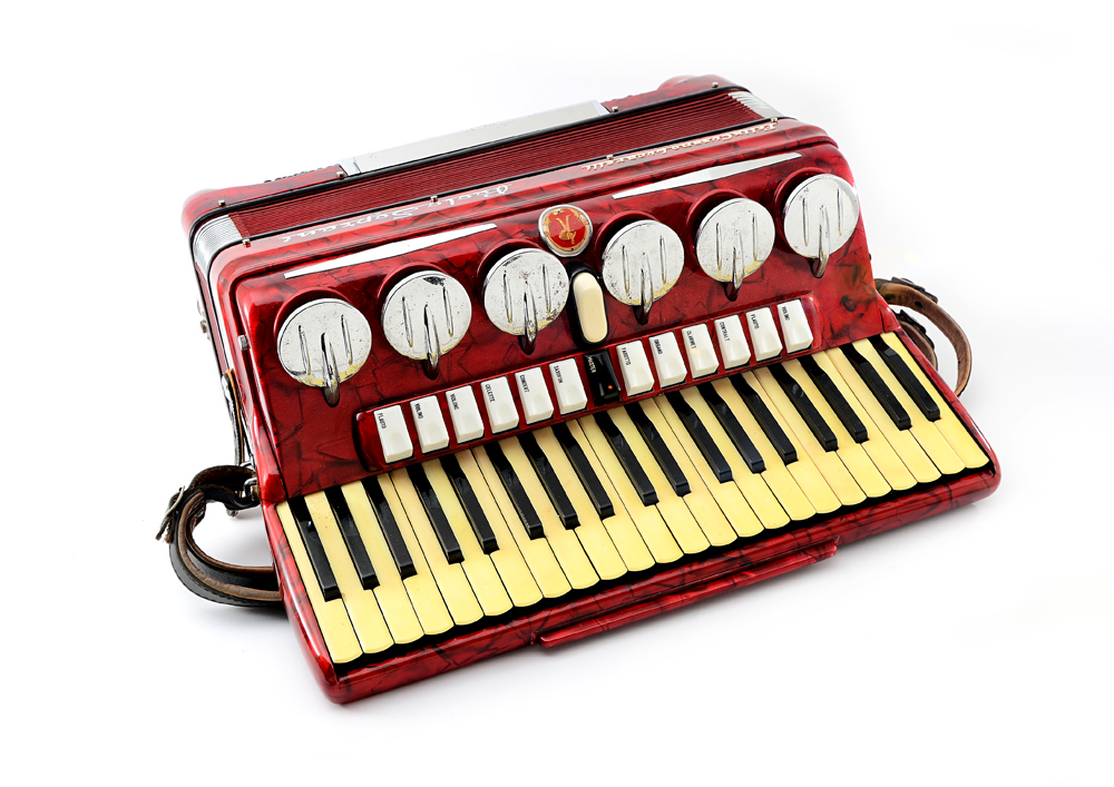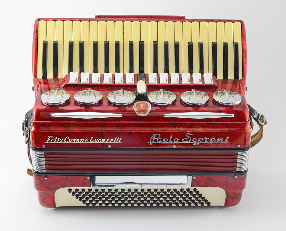 PAOLO SOPRANI ITALIAN 41 KEY ACCORDION: Marbleized red case, by noted Italian accordion maker Paolo Soprani. Bellows appear to be completely intact, overall measures 9 1/2'' h. x 20'' x 16 3/4''. Sold with a hard suitcase 9 1/2'' x 22 1/2'' x 19'' and a portfolio of sheet music.