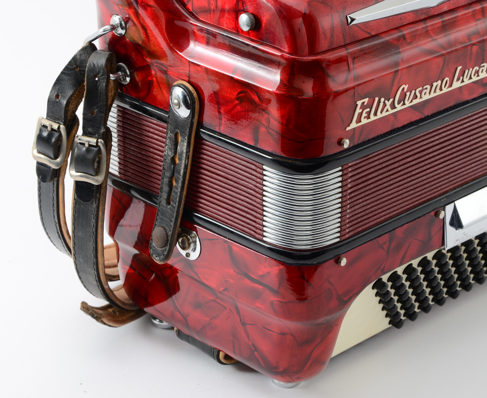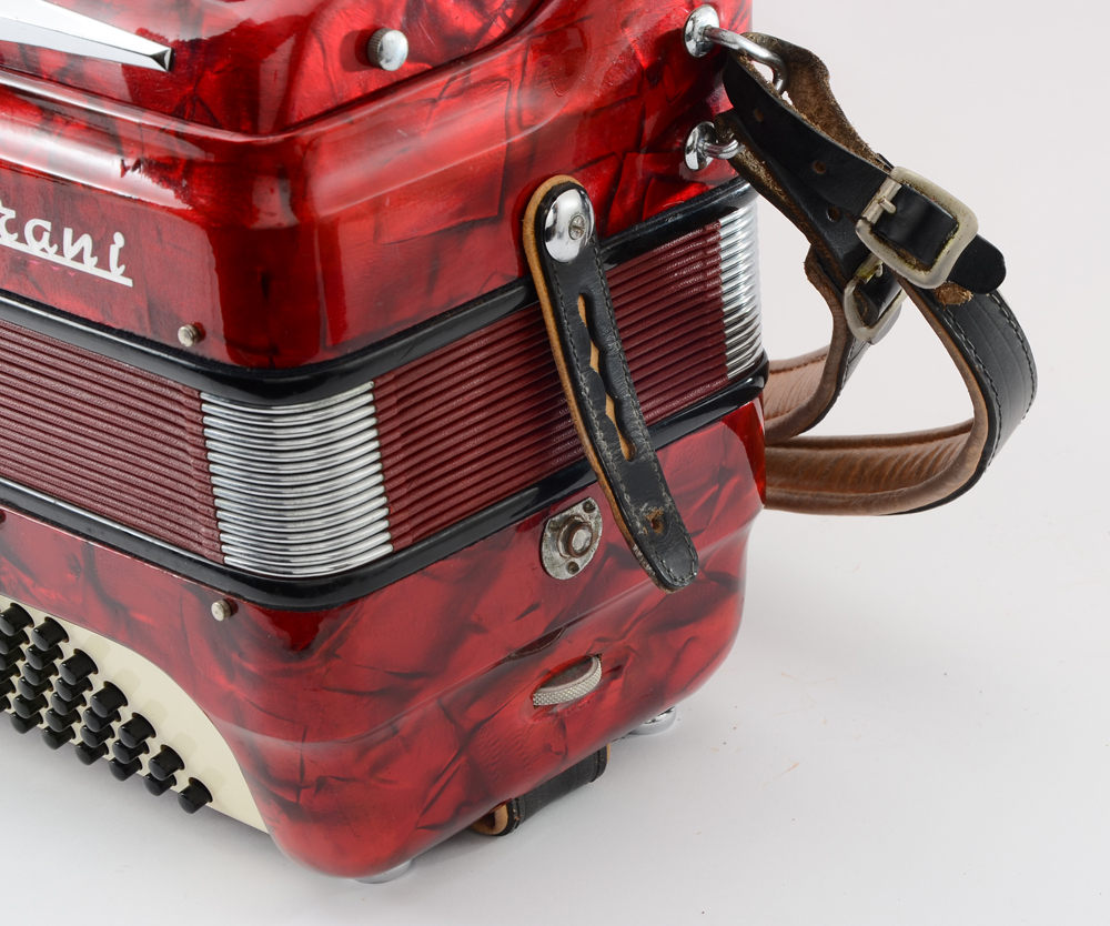 CONDITION: Spotting to chrome, one leather strap missing button. Appears to be in fine playing condition, however we not accordion experts.