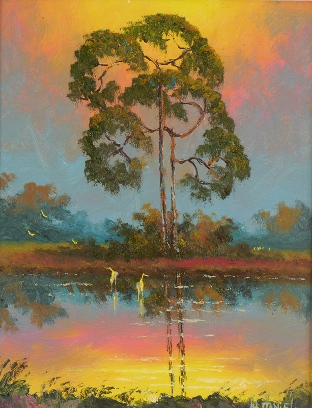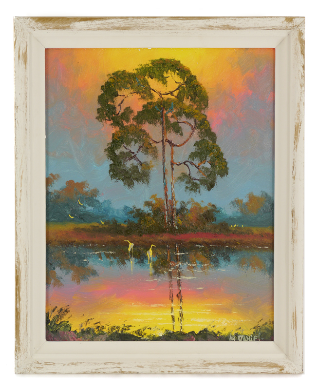 DANIELS, Willie, (American, 20th Century): Vibrant Florida Highwaymen backwaters scene with pine trees and birds, Oil/Board, signed lower right, 14'' x 11'', framed 15 3/4'' x 12 3/4''.